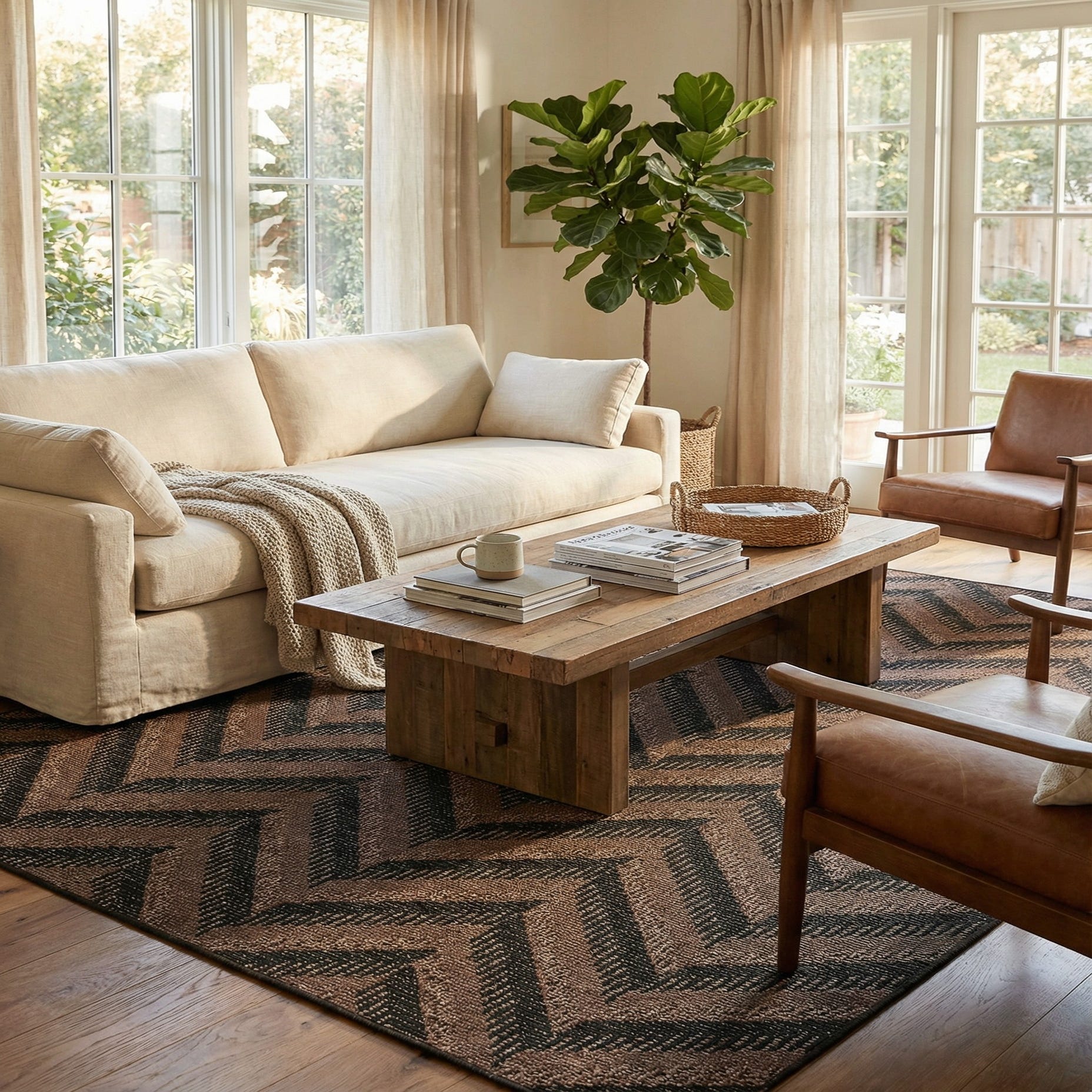 A bold chevron pattern in black runs across a warm brown ground, forming a clean, repeating zigzag with fine herringbone detailing in each stripe. The contrast between the deep black motif and the earthy brown background gives the rug visual depth while keeping the overall look restrained and modern. The surface reads as low-profile and slightly textured — a firm, woven hand that layers well under furniture and stands up to steady foot traffic.