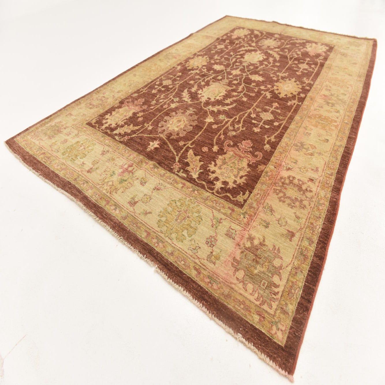 A 6x9 rectangular Peshawar Ziegler rug featuring a rich brown field with intricate botanical and floral patterns in tan and gold, framed by a wide tan border with complementary designs.