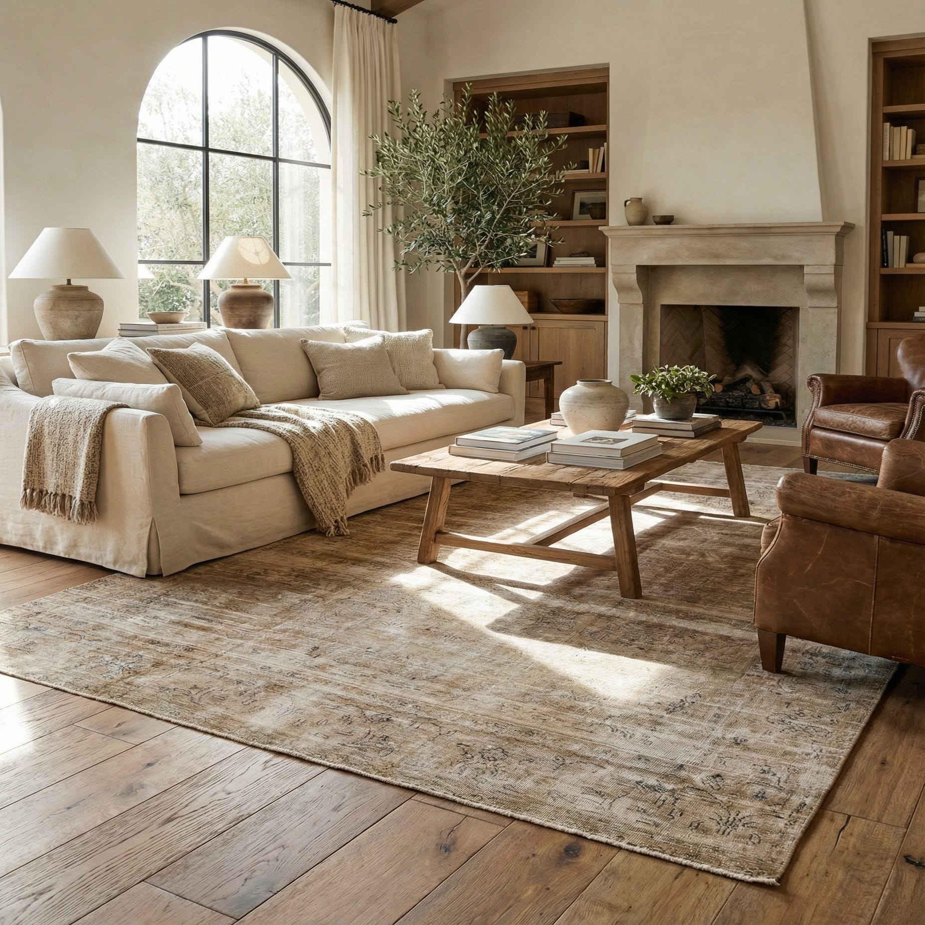 A 6x9 rectangular Ultra Vintage wool rug in browns and tans with a distressed Persian pattern.