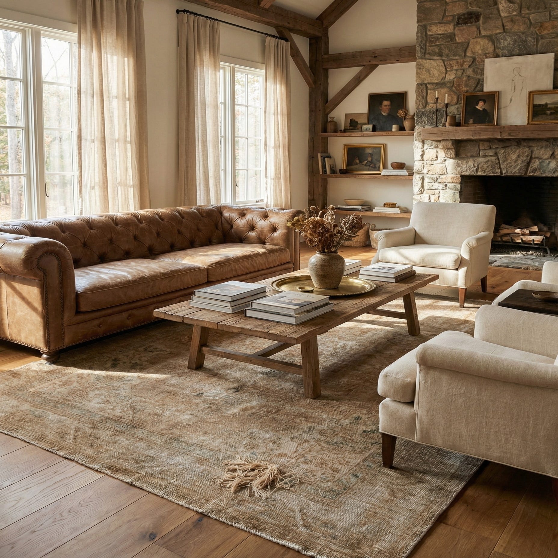 A 6x9 rectangular Ultra Vintage rug in browns and tans, featuring a faded Persian medallion pattern, perfect for a living room.