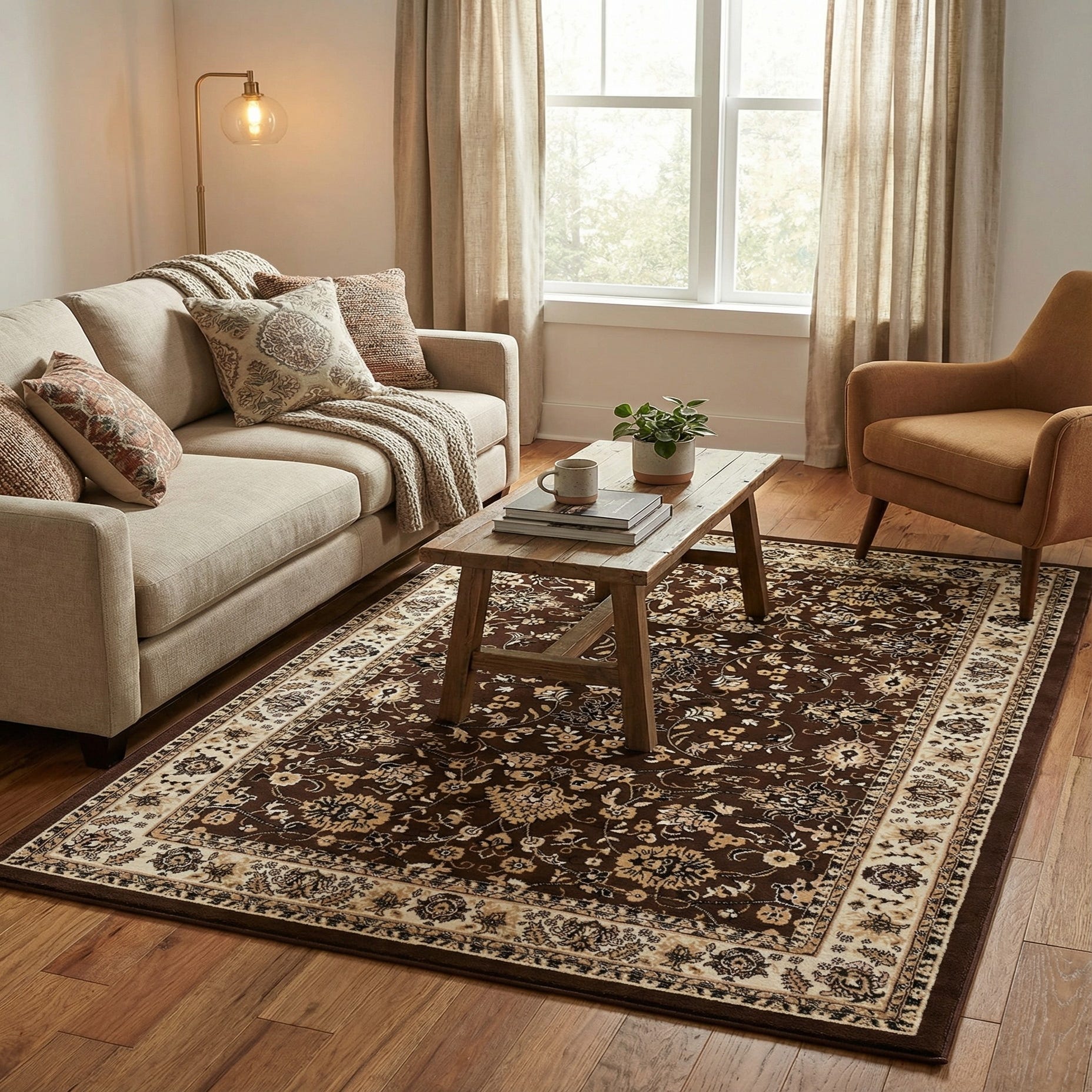 A classic, Persian-inspired pattern rests on a warm brown background, with an ivory-cream outer border that frames scrolling vines, stylized palmettes and small floral sprigs. Black and tan accents outline the motifs and add depth to the symmetrical layout, creating a balanced, traditional look. Machine made from 100% polypropylene, the surface has a soft but structured hand and a low-to-medium pile that keeps the pattern crisp while feeling comfortable underfoot.