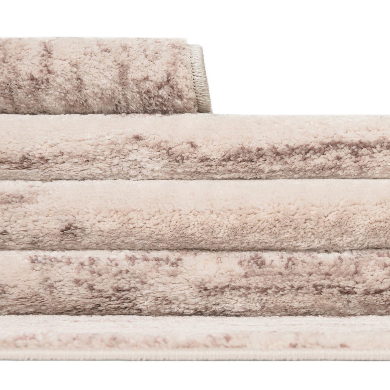 A softly striated abstract pattern plays across a warm brown background, with beige and ivory highlights that create a gentle, weathered effect. The low-profile pile has a smooth, slightly plush hand and a subtle sheen that catches light without dominating a room. Machine-made from 65% polypropylene and 35% polyester, the construction delivers an even surface and consistent color depth across the octagonal shape.