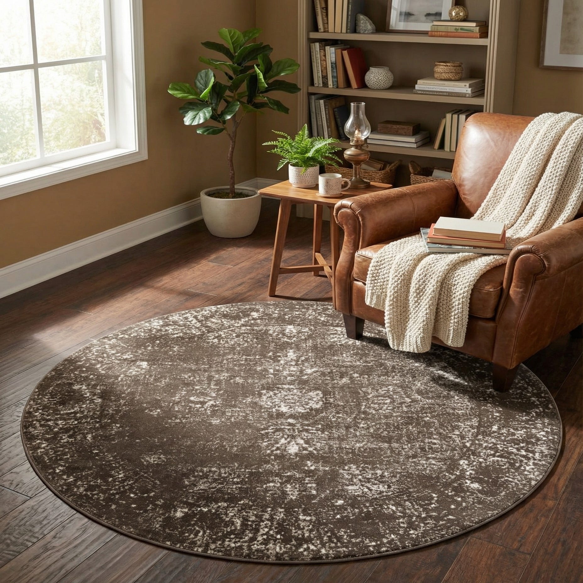 The organic, distressed pattern gives the rug a versatile quality, able to complement a range of interior styles from modern minimalist to rustic chic. Its round shape and size make it an ideal choice for anchoring furniture in a living room, under a round dining table, or creating a focal point in a spacious foyer. The muted, earth-toned palette allows for easy integration with various color schemes, providing a subtle yet sophisticated touch to any space.
