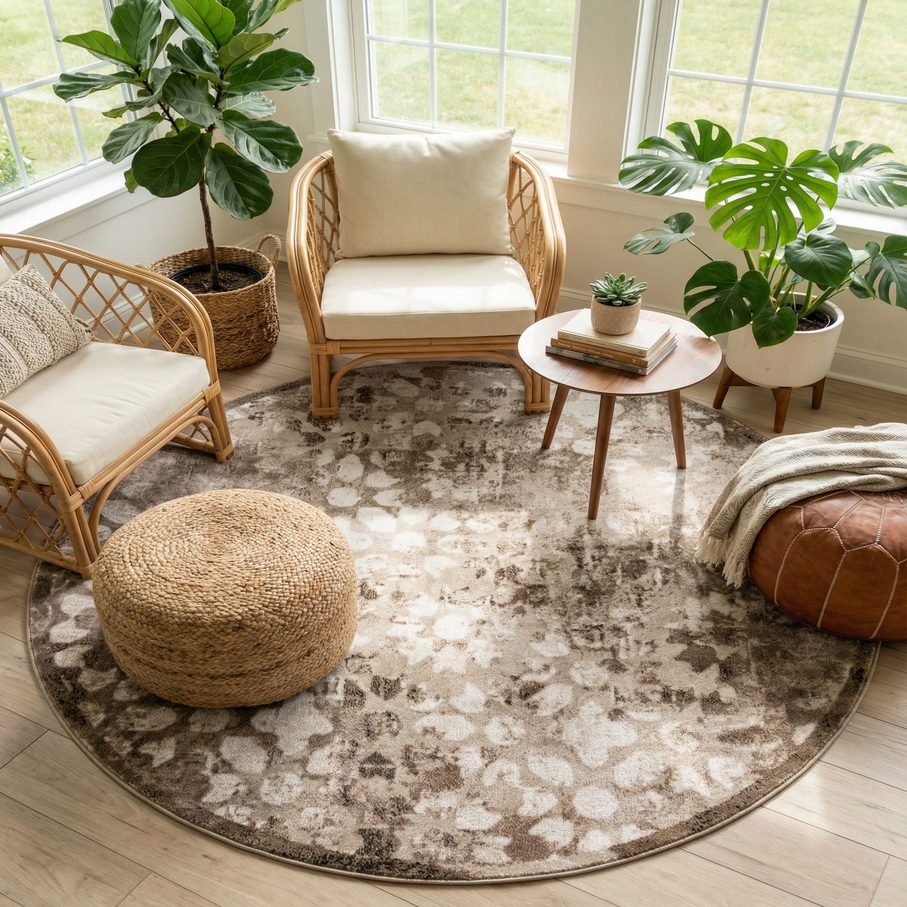 This piece works well in transitional and contemporary interiors—place it beneath a round dining table to anchor the setting, use it to define a cozy seating group in a living room, or layer it in a neutral-toned bedroom for added warmth. It pairs nicely with warm wood finishes, leather sofas, and linen fabrics, and complements palettes built around beige, ivory, and earth tones for a cohesive, relaxed look.