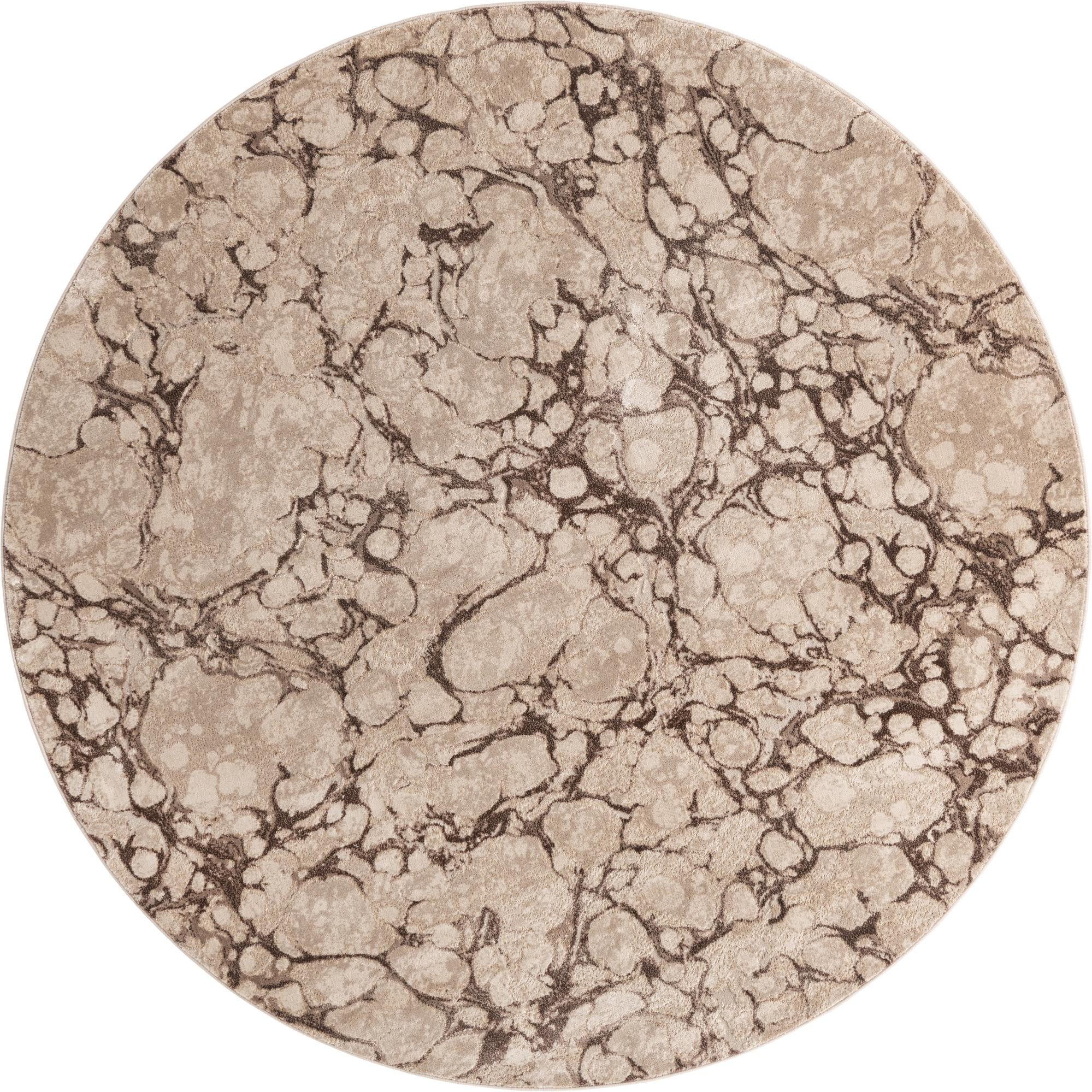 A round 7' 0 x 7' 0 Rugs.com Oasis rug featuring a modern abstract pattern in varying shades of brown and tan, with a textured pile.