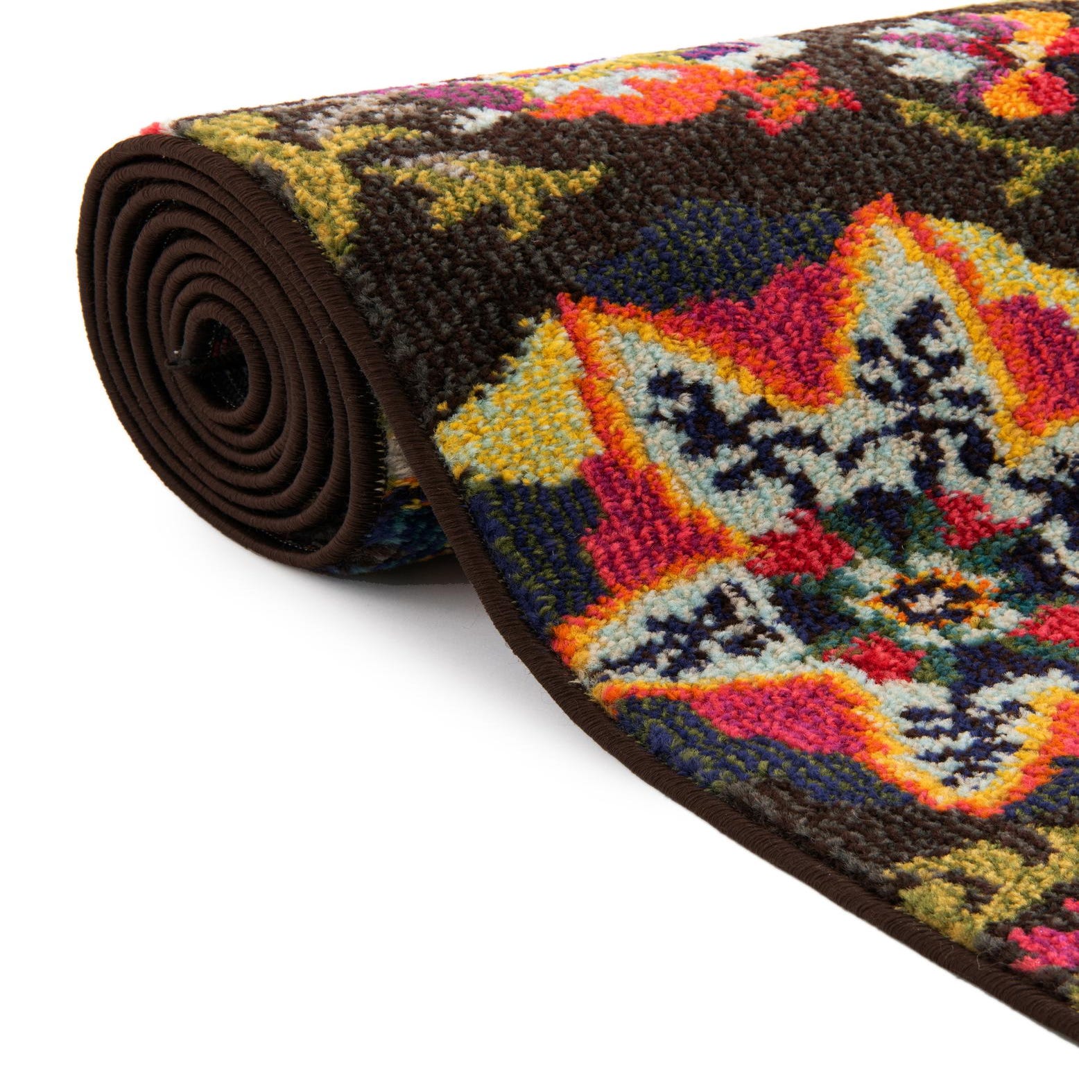 The Hyacinth Collection presents a vibrant 7 ft runner rug, machine-woven of 100% polypropylene that ensures durability and ease of care. This piece's intricate pattern, set against a rich brown background, showcases an eclectic mix of floral motifs and aesthetically pleasing symmetry. It is adorned with a diverse color palette that includes shades of brown, gold, green, light blue, light green, navy blue, red, orange, violet, and pink, offering an abundance of hues that compliment a variety of interior settings.