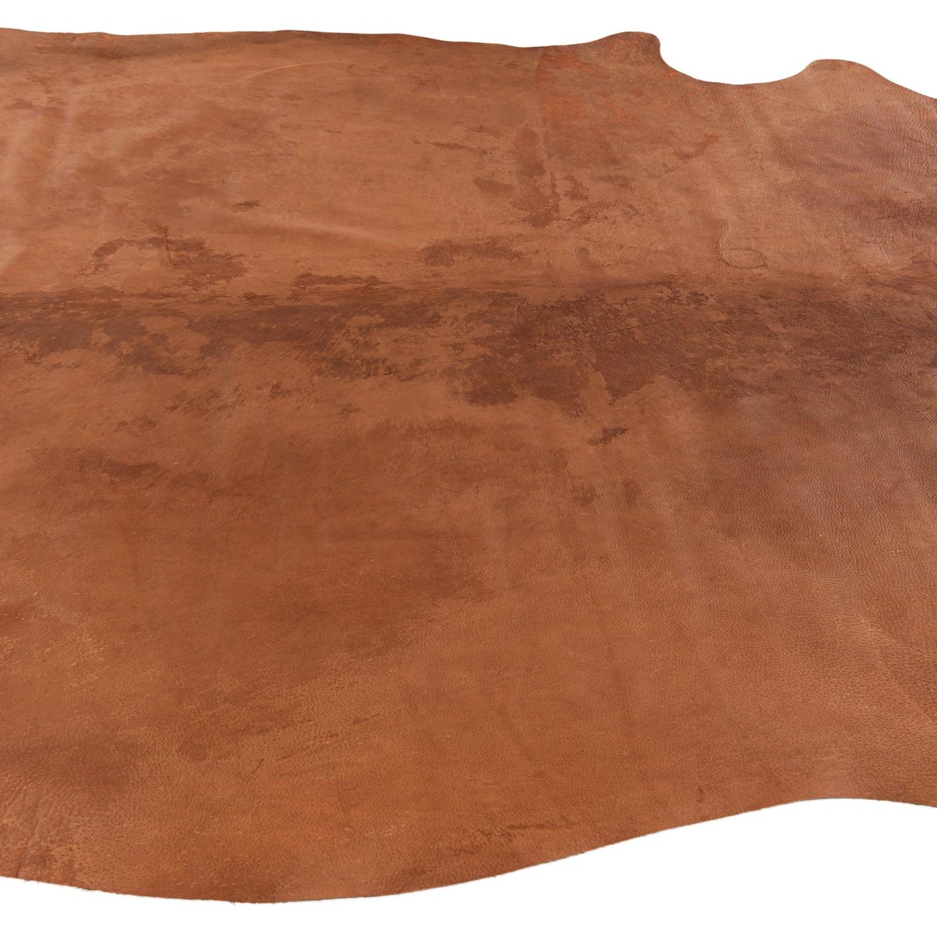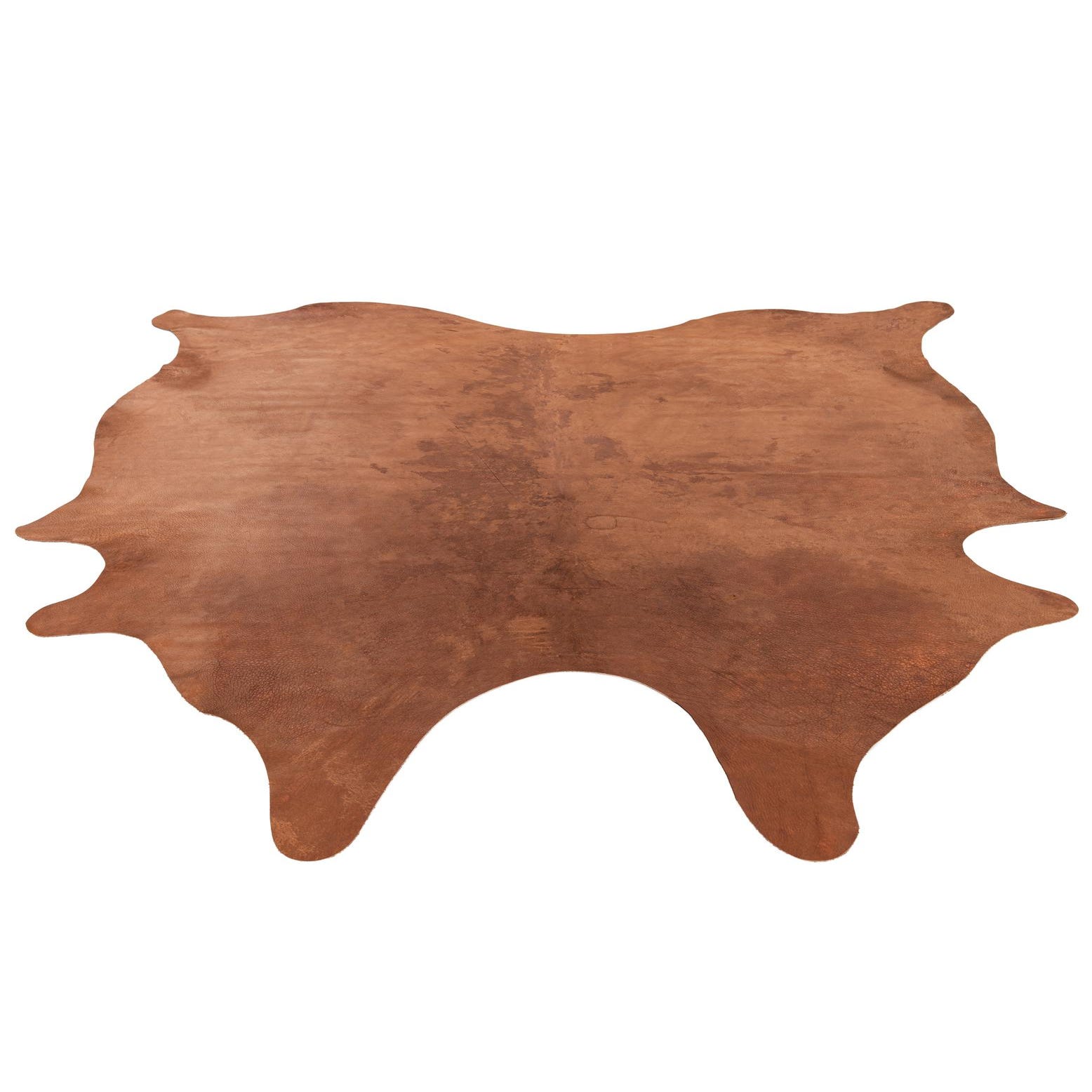 A 6' 8 x 6' 8 square brown cowhide leather rug with a natural, irregular shape and textured flat pile.