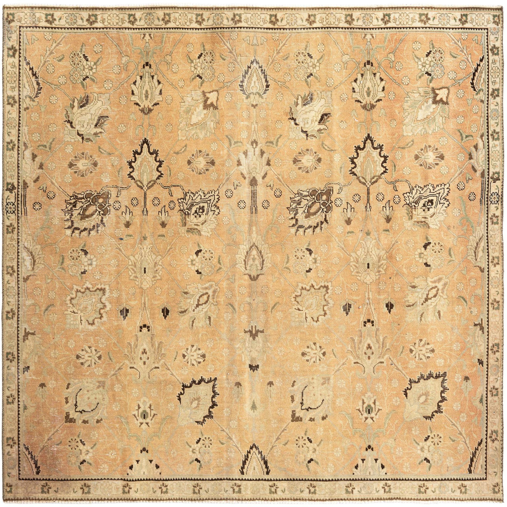 A 7' 1 x 7' 5 square Hamedan tribal wool rug in shades of brown and tan, featuring an intricate floral and medallion pattern with a decorative border.