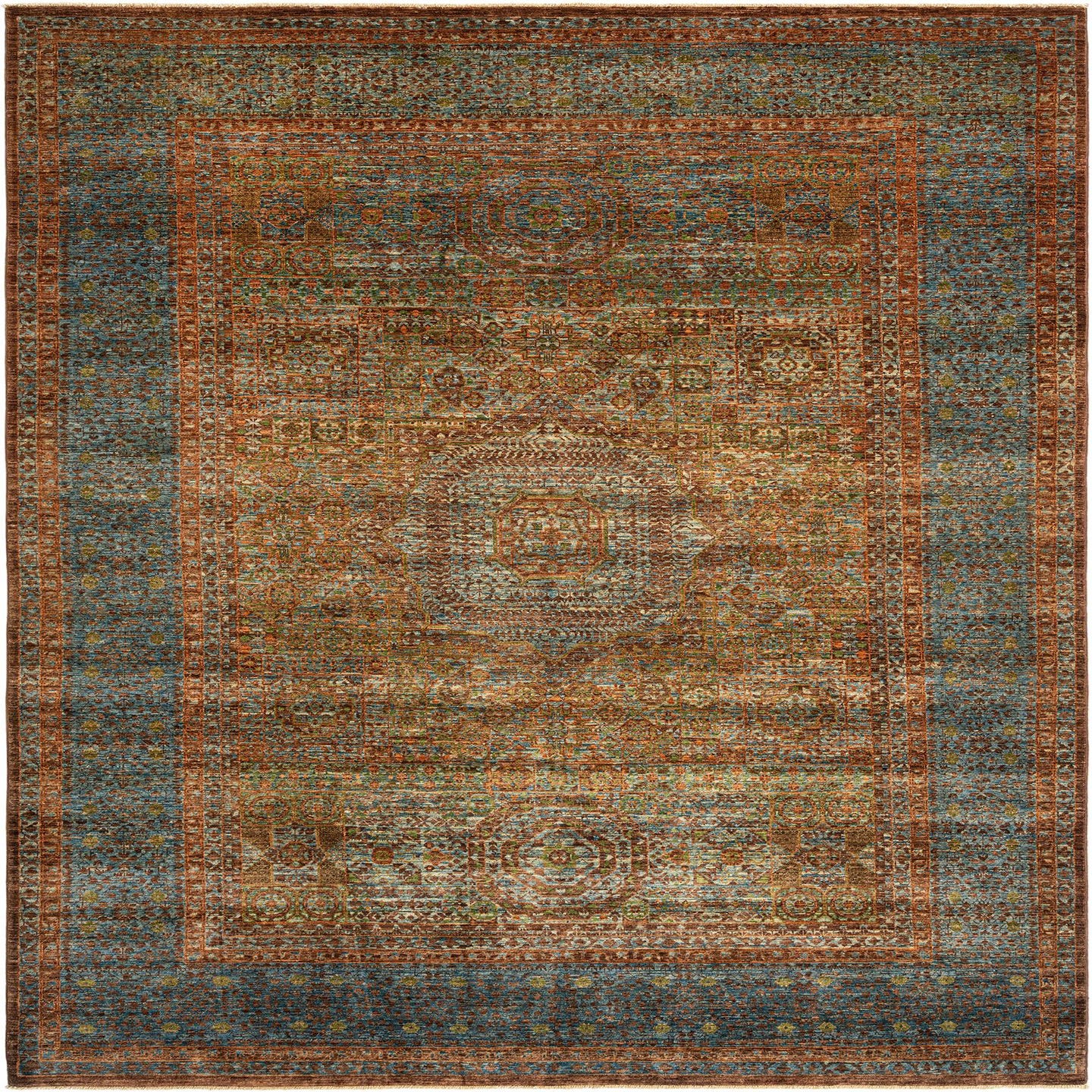 Primary color is Brown. Colors in this rug include: Brown, Brown, Blue, Green, Orange.