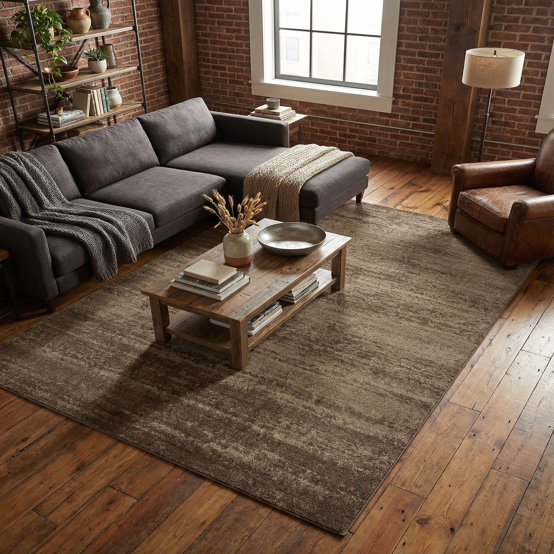 Primary color is Brown. Colors in this rug include: Brown, Beige.