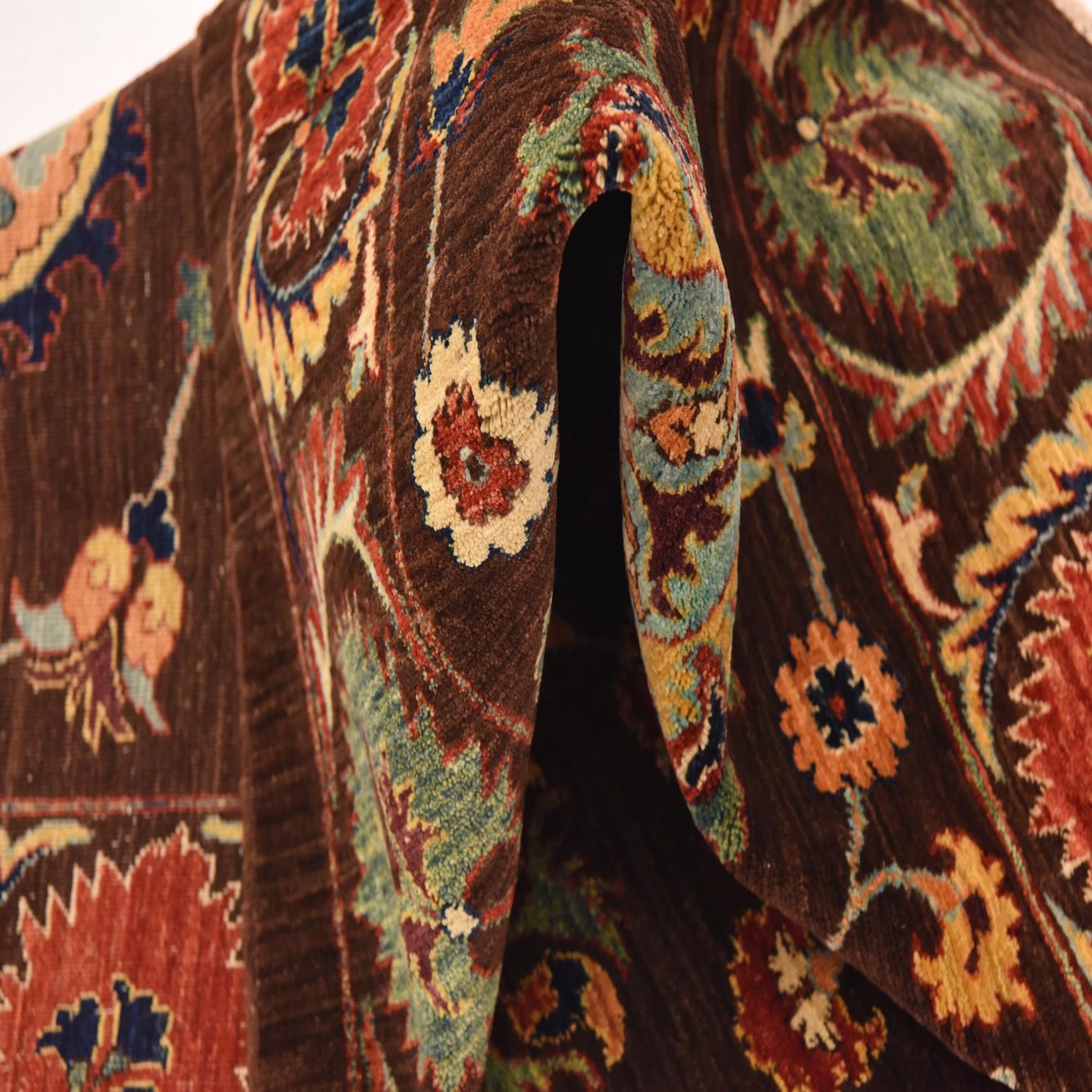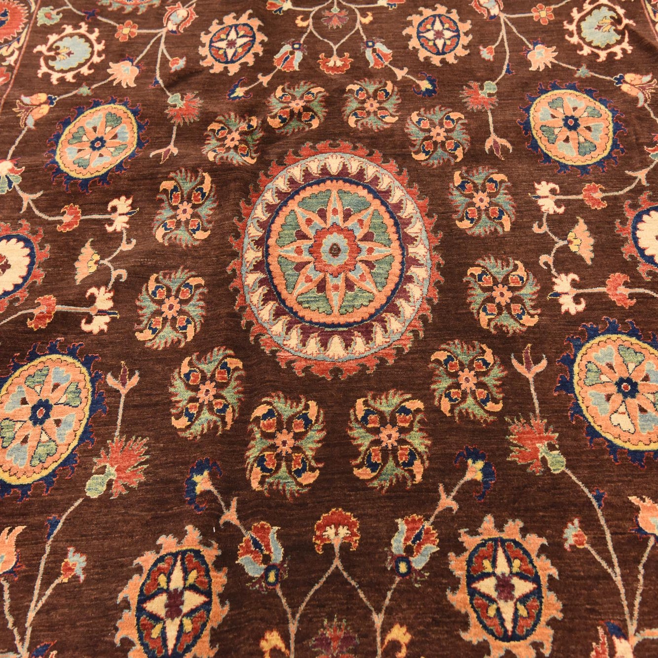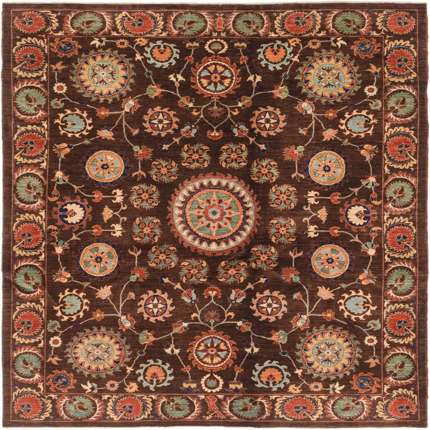 Primary color is Brown. Colors in this rug include: Brown, Blue, Cream, Olive, Red, Salmon, Peach.