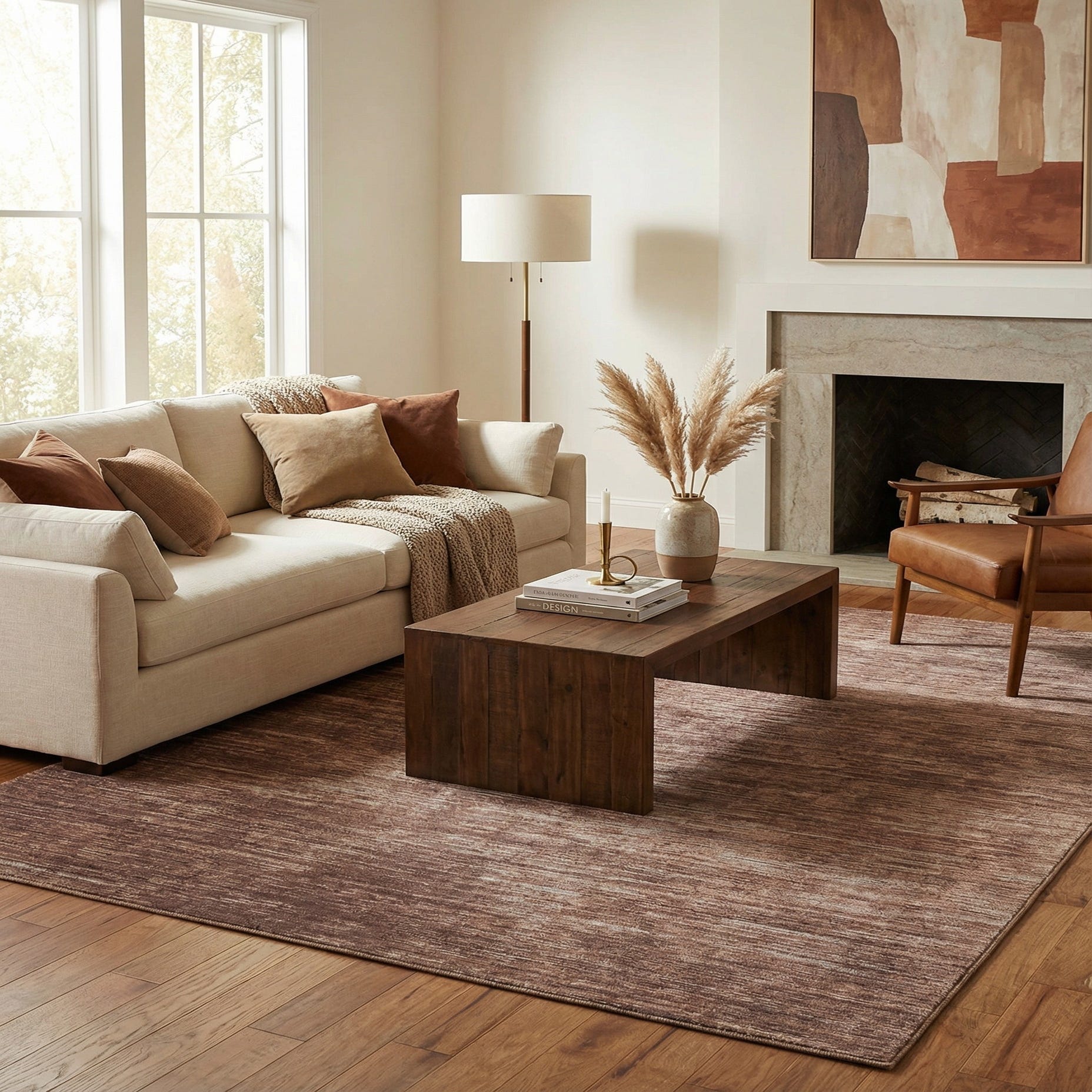 A 7x10 rectangular Asha collection rug by Rugs.com, featuring a modern brown and tan textured stripe pattern.