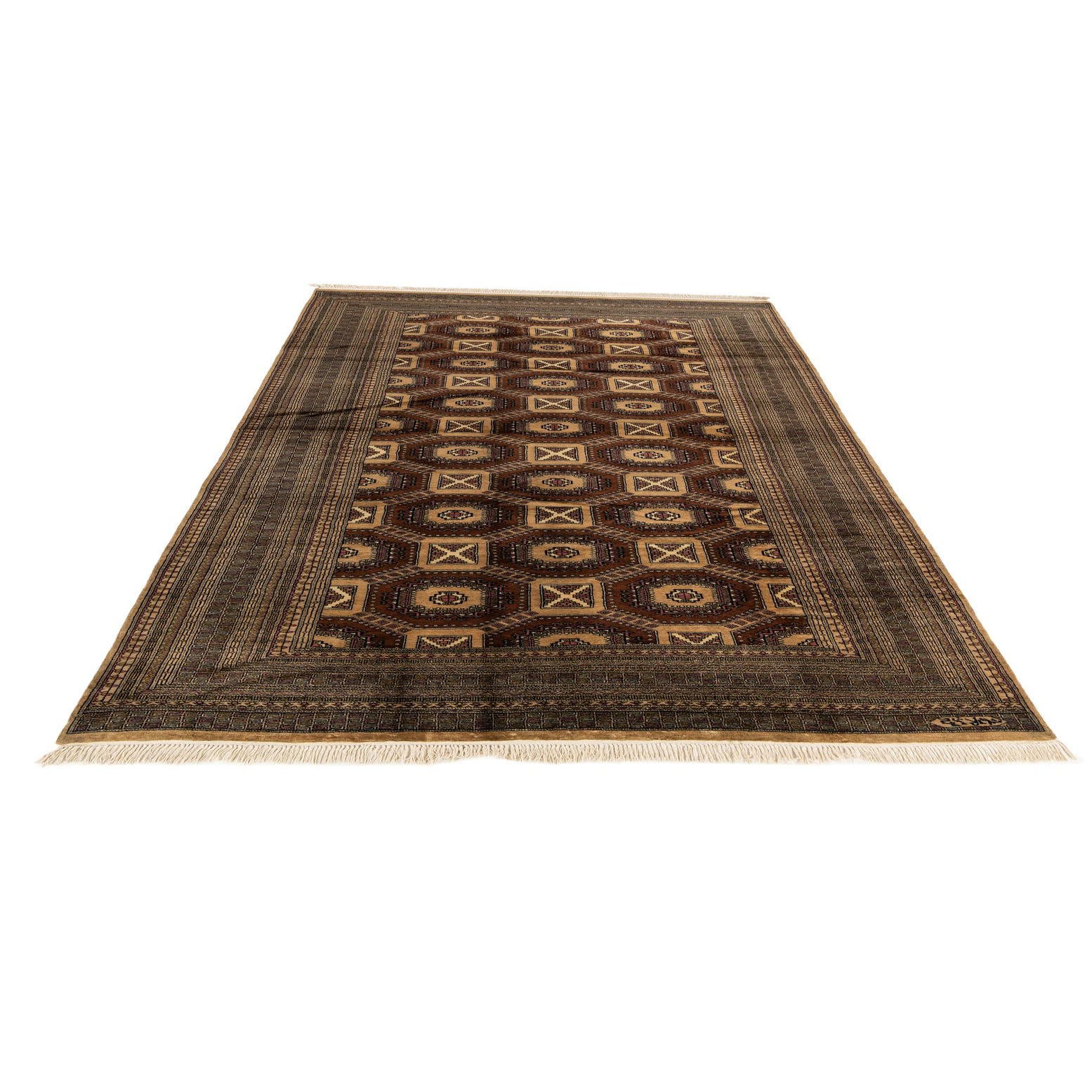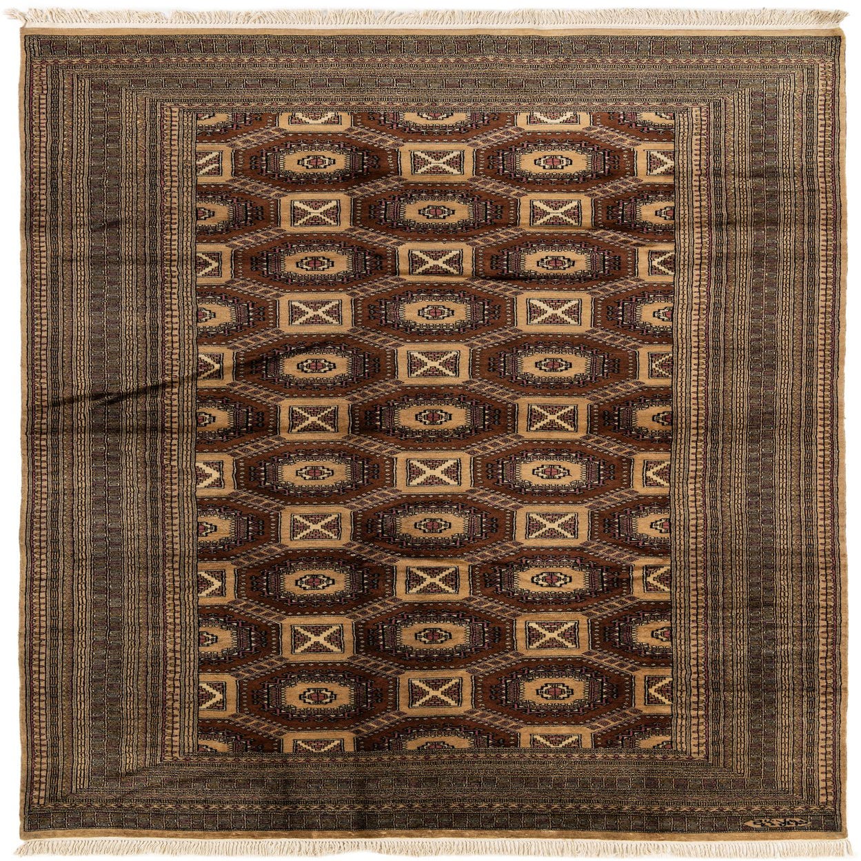 A 7x10 rectangular Bokhara rug featuring a traditional tribal pattern in rich browns and tans, with intricate geometric motifs and a detailed border.
