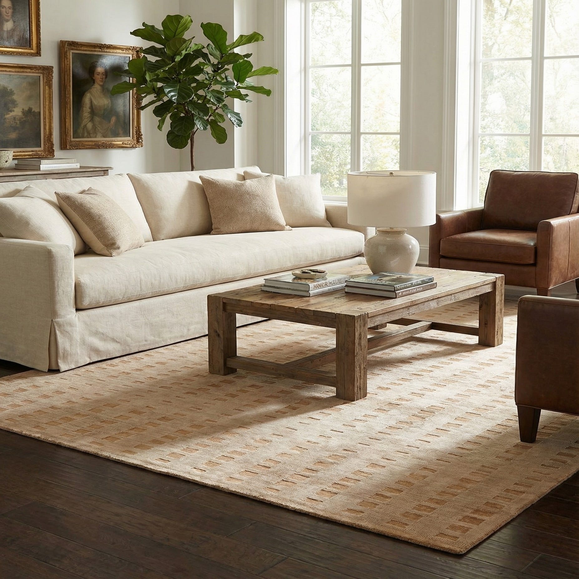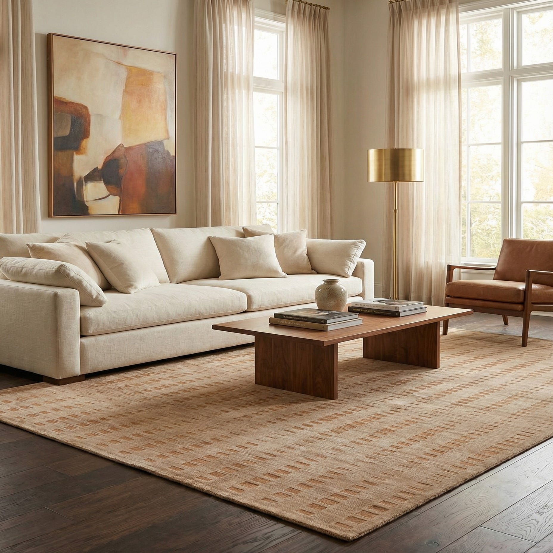 This rug would seamlessly integrate into interiors that favor earth tones and natural materials, such as those with wooden furnishings or a rustic aesthetic. It is also versatile enough to serve as a grounding element in more contemporary and minimalistic decors, bringing both visual interest and balance.