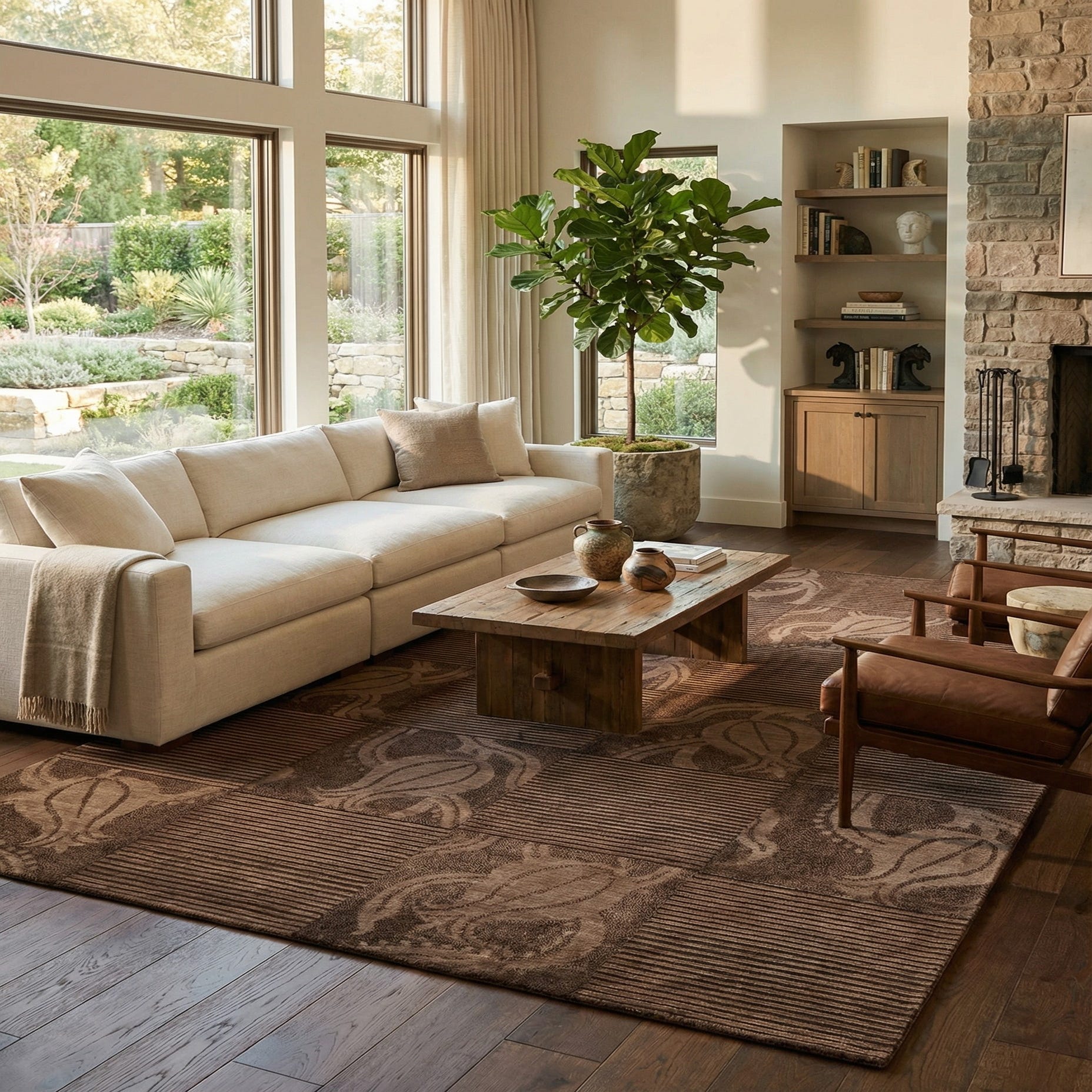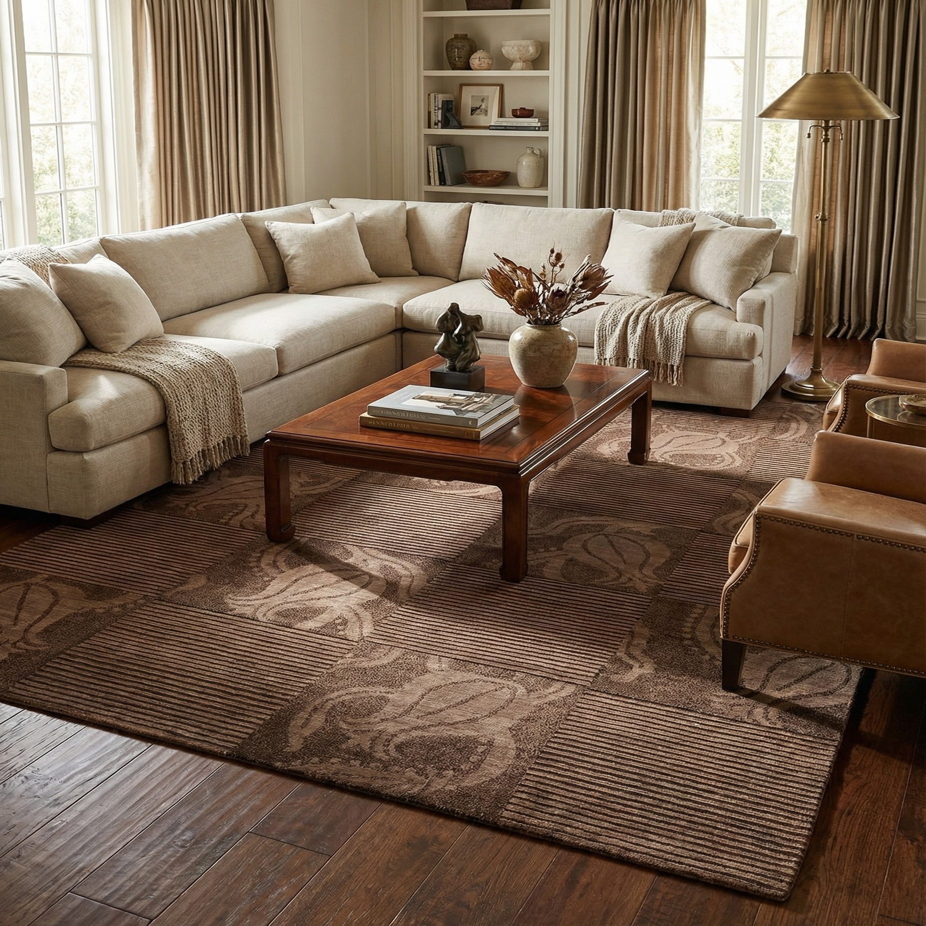 Primary color is Brown. Colors in this rug include: Brown, Light Brown.