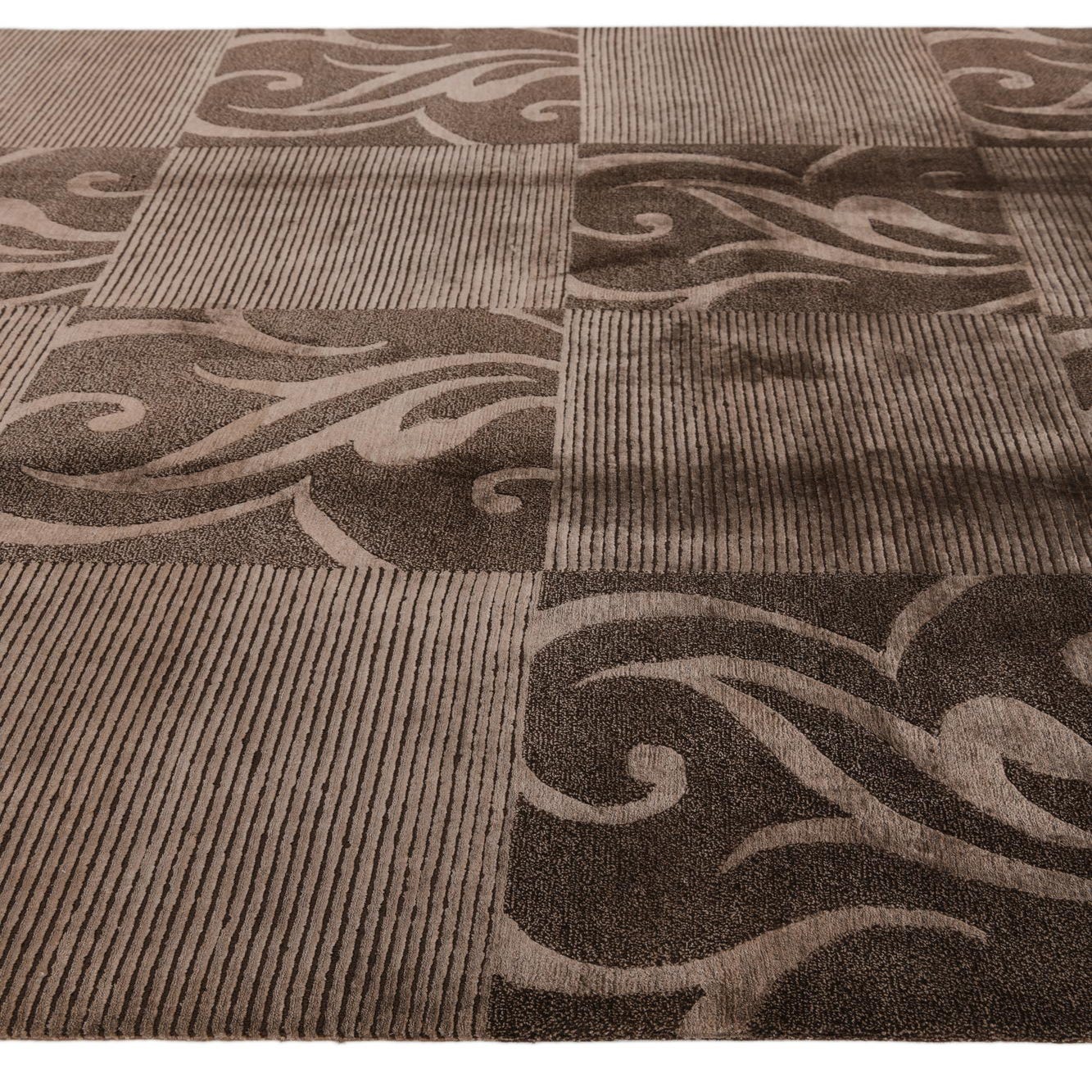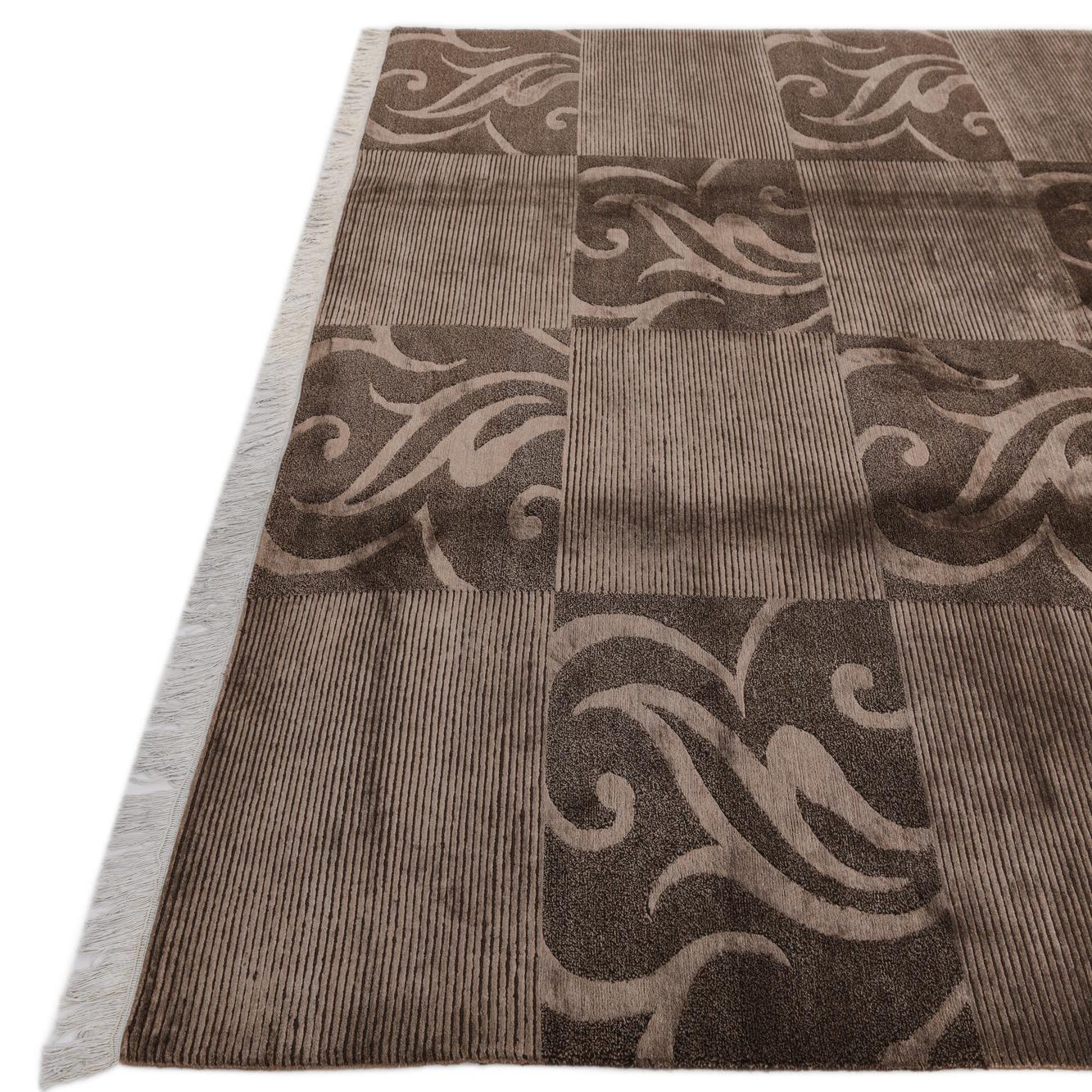 A 7x10 rectangular Darya Collection wool rug featuring a modern oriental pattern of alternating dark brown abstract swirls and tan striped blocks, with white fringe.