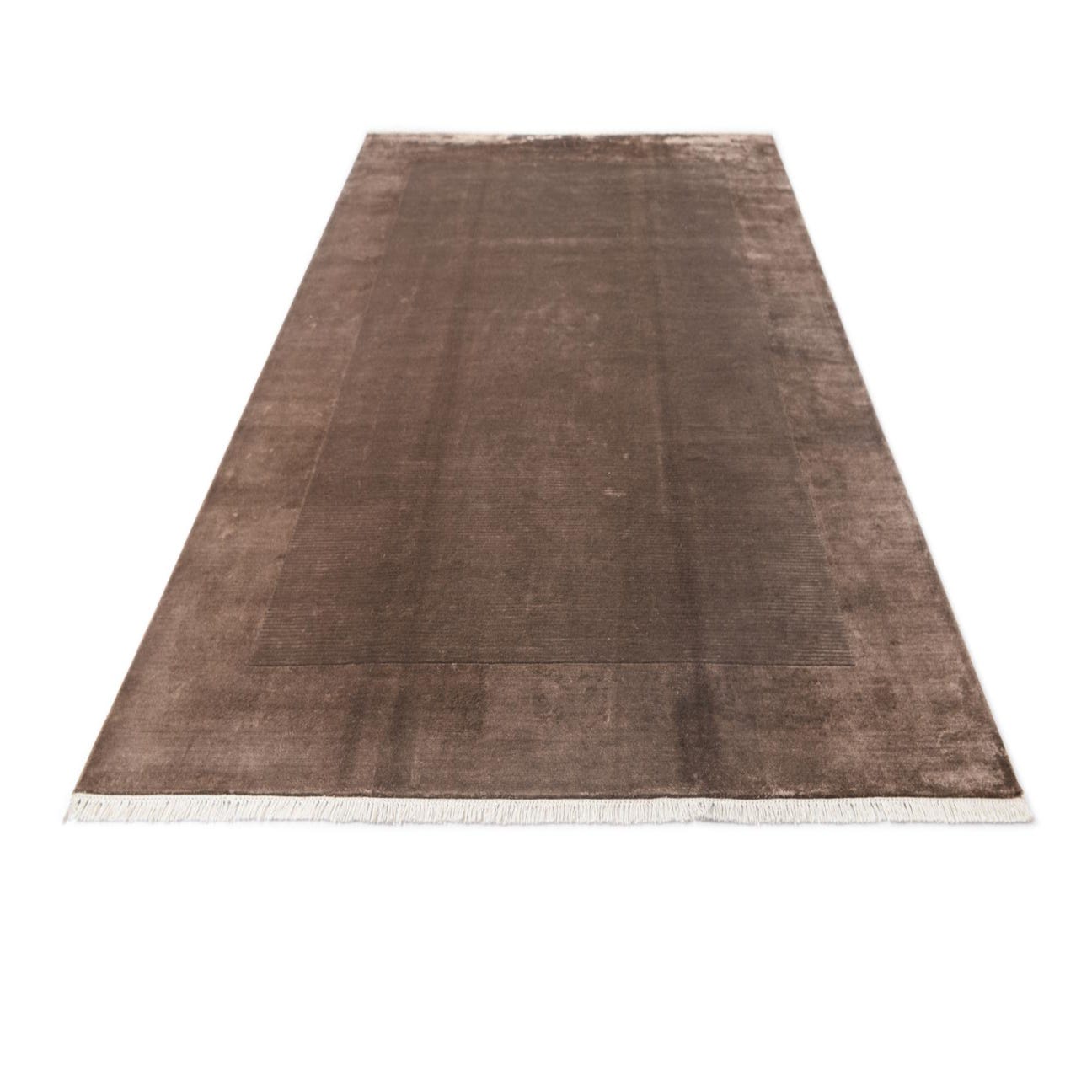 This Darya Collection rug is a hand-knotted 7x10 piece, crafted from 100% wool, offering a luxurious and long-lasting floor covering. The rug presents a brown background with subtle variations in light brown, which creates a sophisticated gradient effect. The minimalist design with its clean lines and slight color transitions lends itself to a modern, understated aesthetic. The texture is characteristically soft and plush underfoot, a testament to its high-quality wool construction.