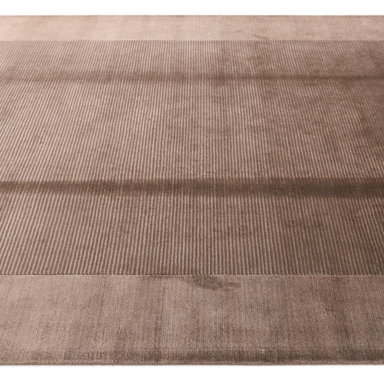 A 7x10 rectangular Darya Collection wool rug in varying shades of brown, featuring a modern striped pattern with a solid border.