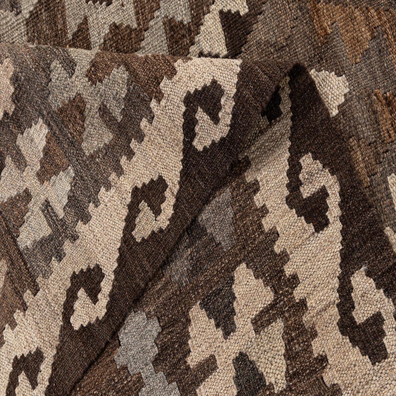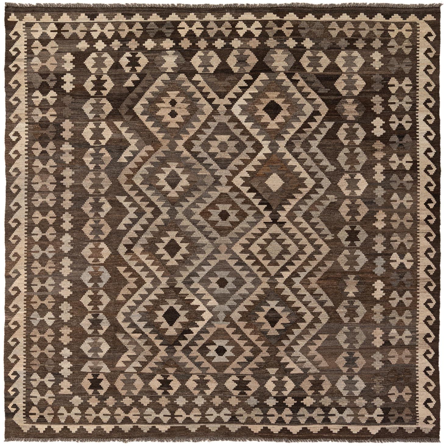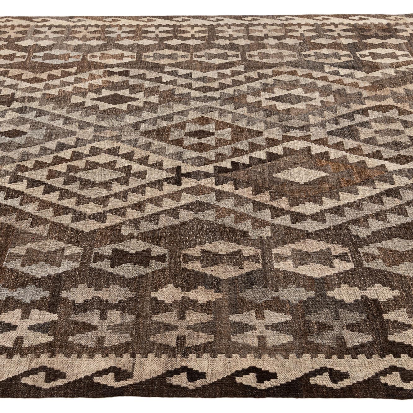 A 7x10 rectangular Kilim Maymana rug featuring a tribal geometric pattern in shades of brown and tan, perfect for a living room.