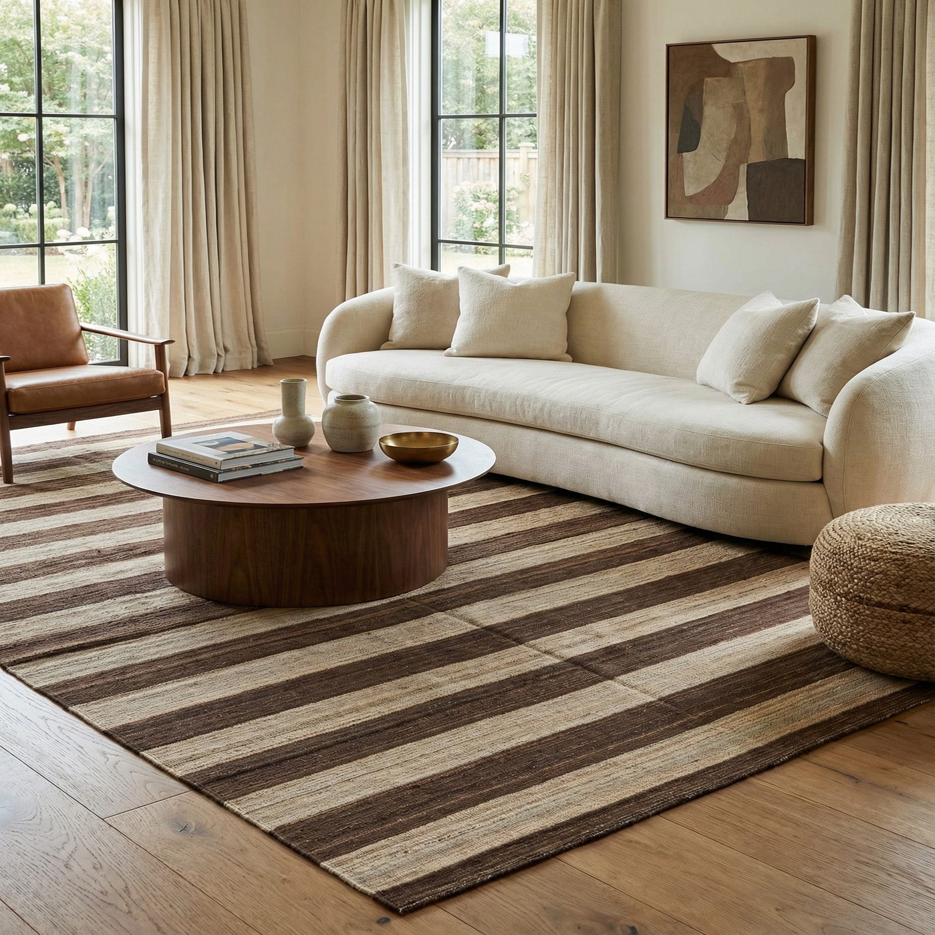 A 7x10 rectangular flatweave rug with alternating horizontal stripes of dark brown and light tan, suitable for a living room.