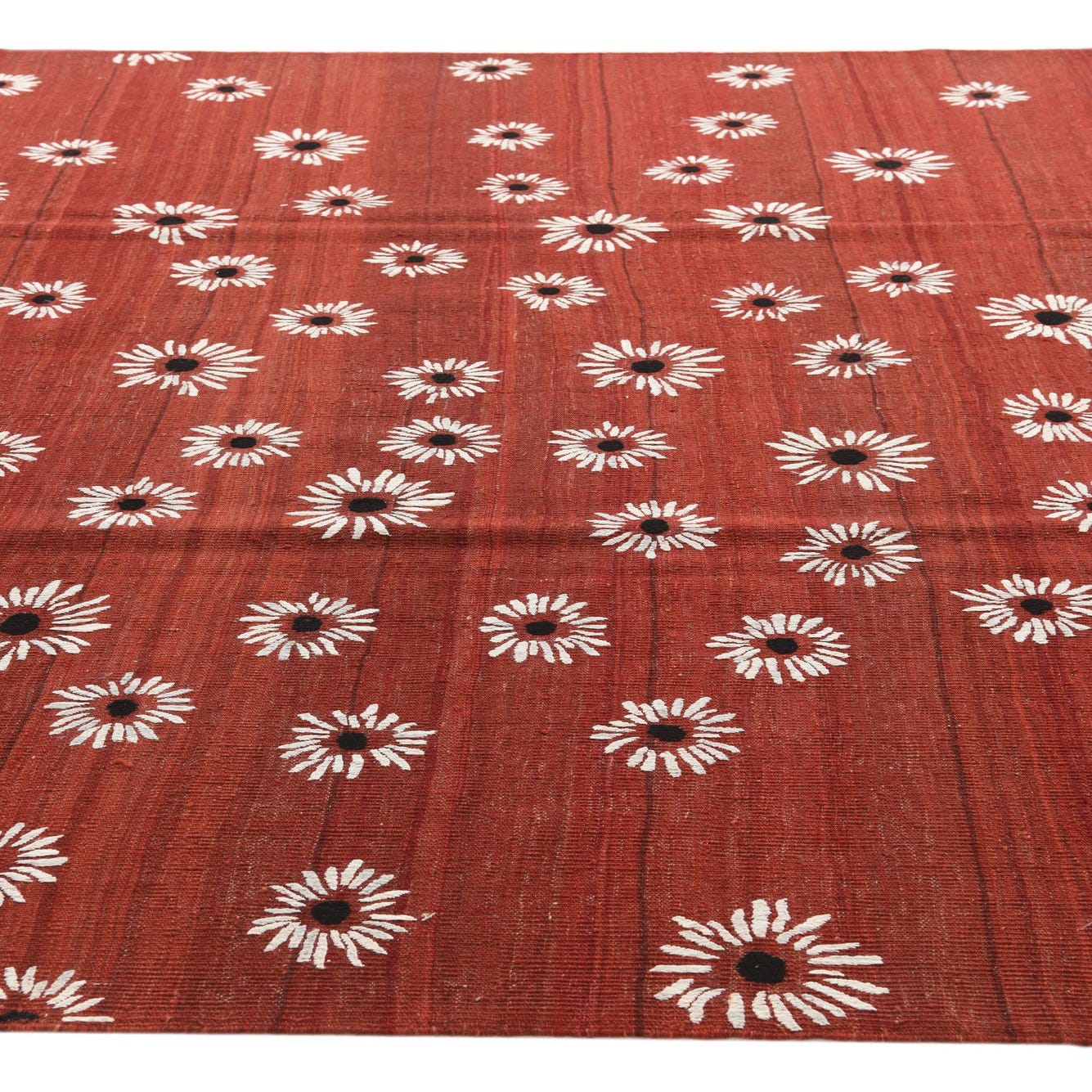 A 7x10 rectangular flatweave rug in a rich brown hue with scattered white and black tribal flower patterns.