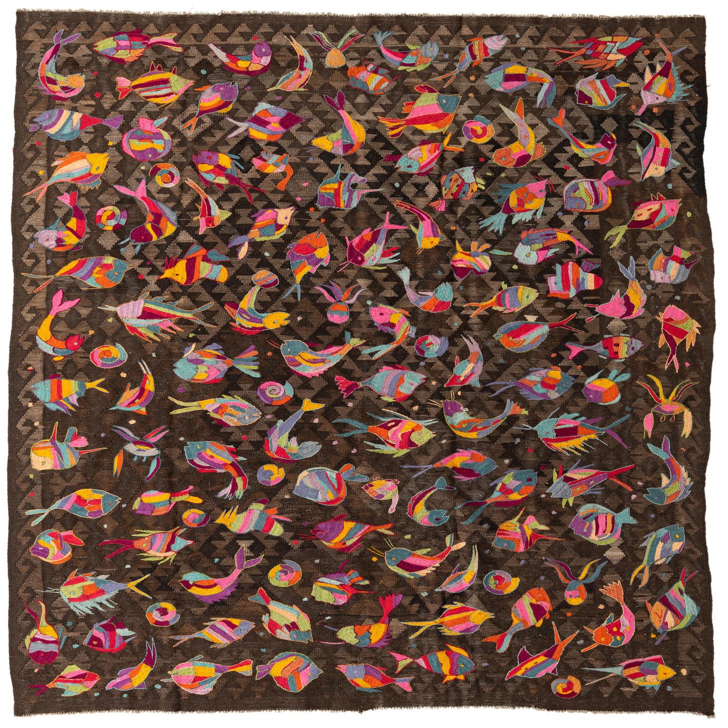 A 7x10 rectangular Kilim Suzani rug featuring a dark brown background with a subtle geometric pattern, adorned with numerous colorful, abstract fish and sea creature motifs in shades of pink, yellow, blue, and orange.