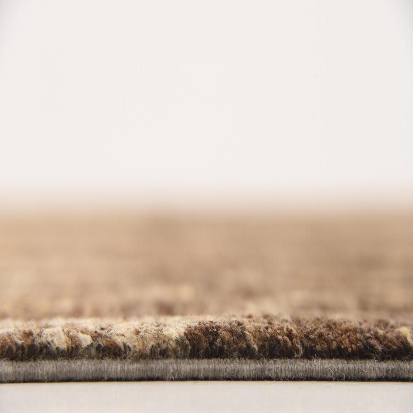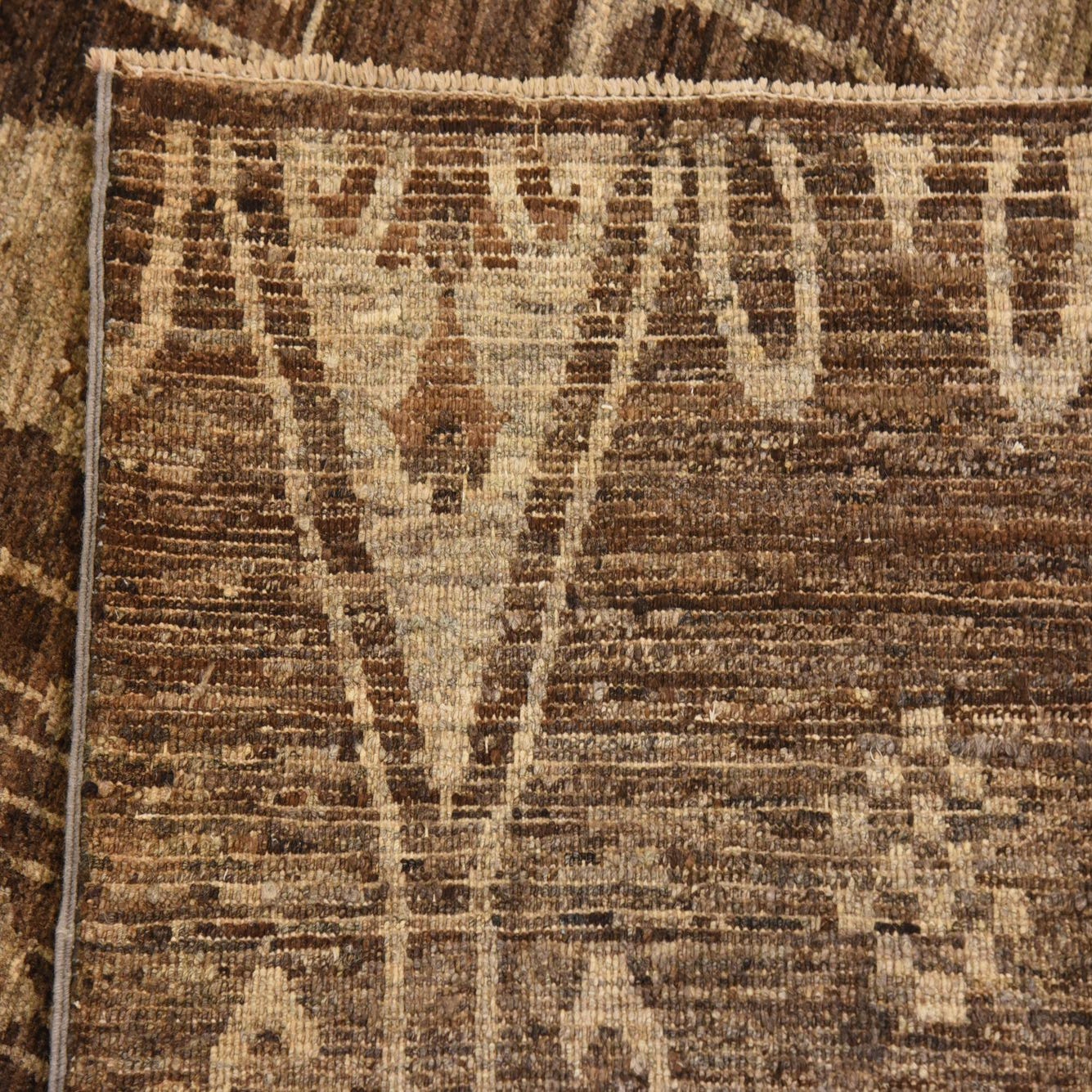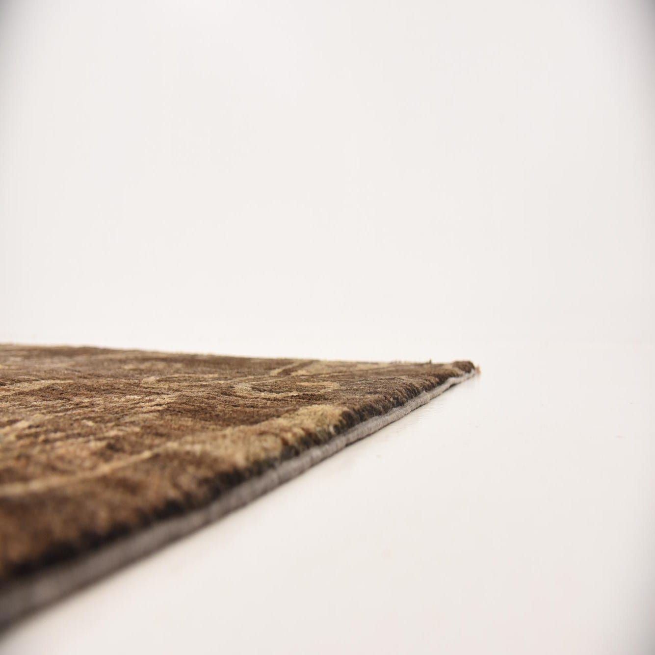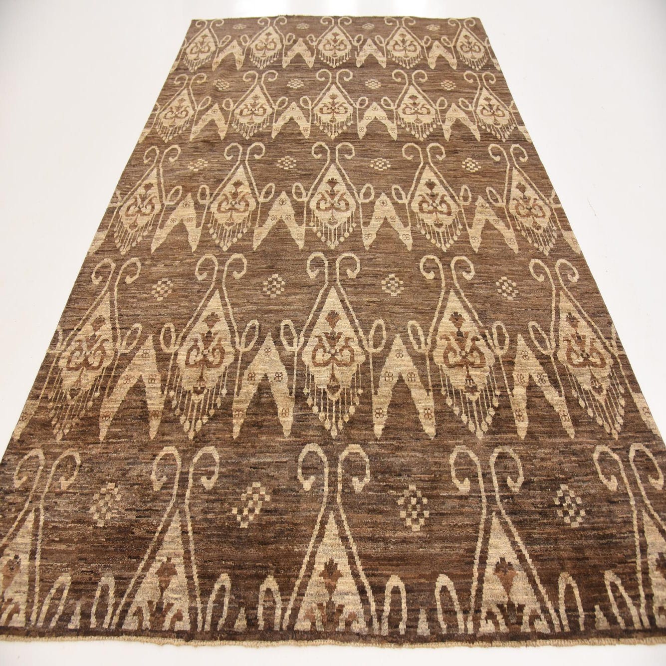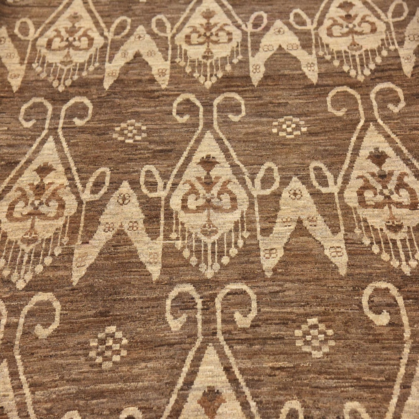 A handsome, ikat-inspired motif unfolds across a warm brown field, traced in soft beige for a layered, organic look. The repeating medallions and scrolling accents create a rhythmic, slightly vintage feel that’s rooted in traditional weaving but updated for contemporary interiors. Hand-knotted from 100% hand-spun wool, the rug has a low-to-medium pile with gentle tonal variation and a pleasing, slightly slubbed texture that gives the surface depth and a tactile warmth underfoot.