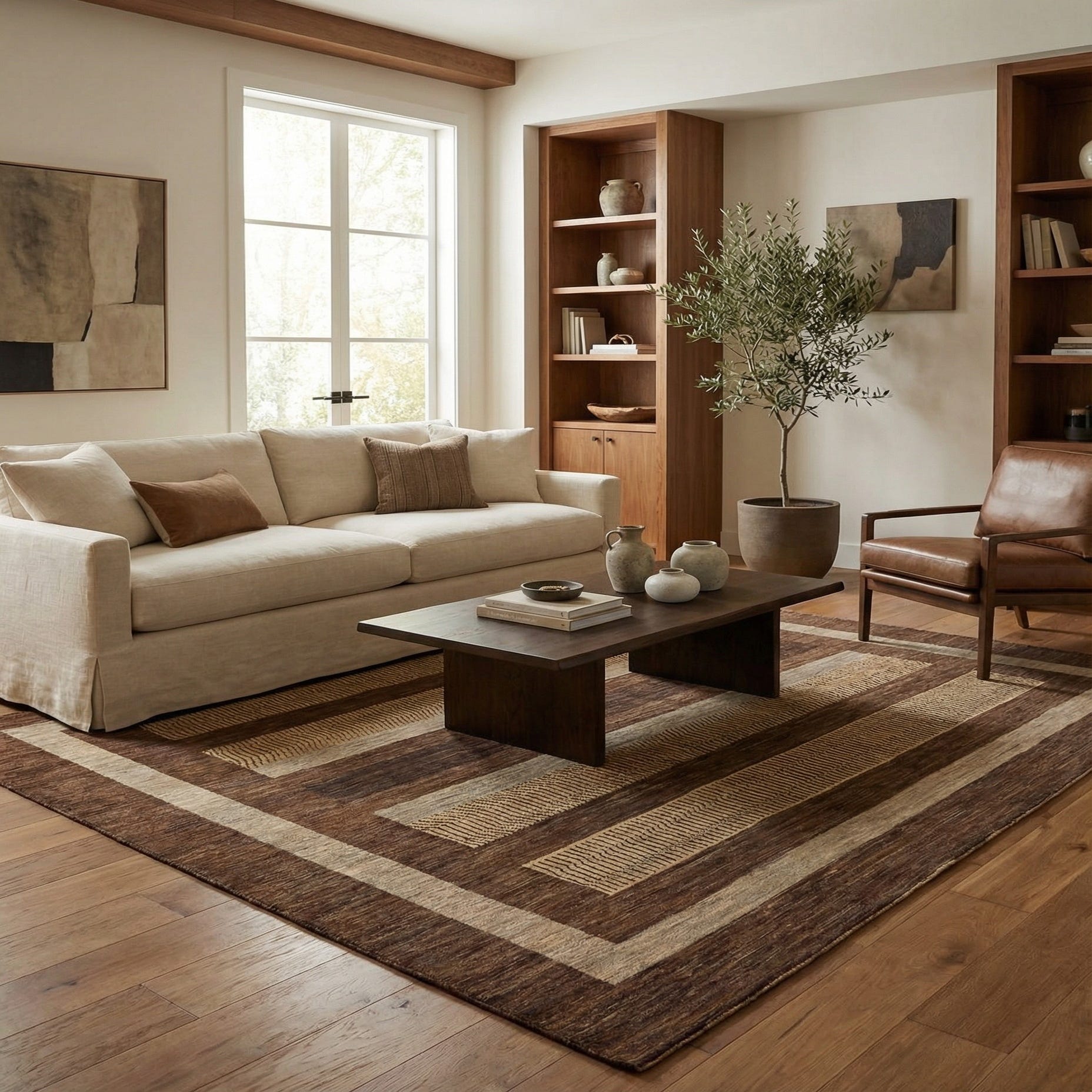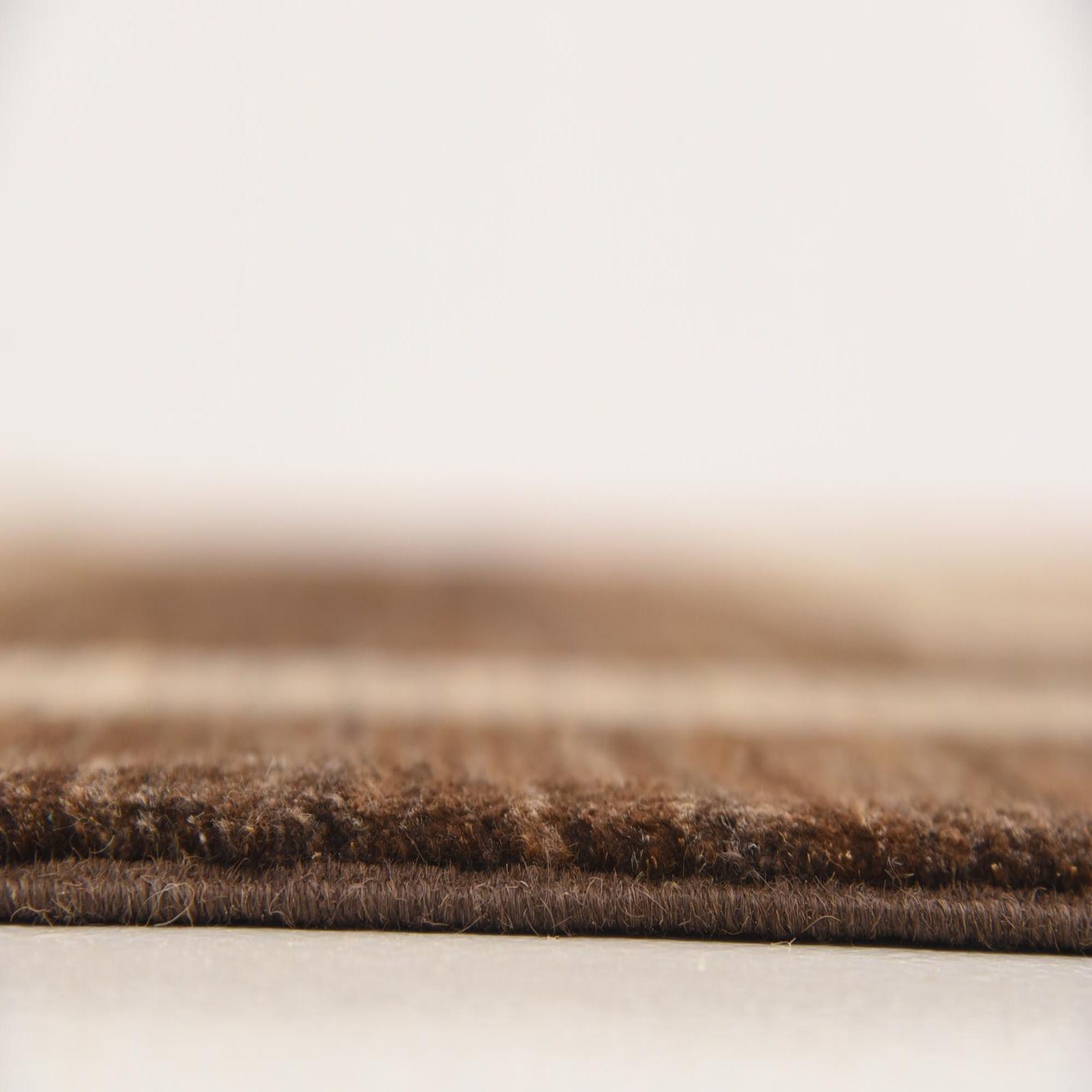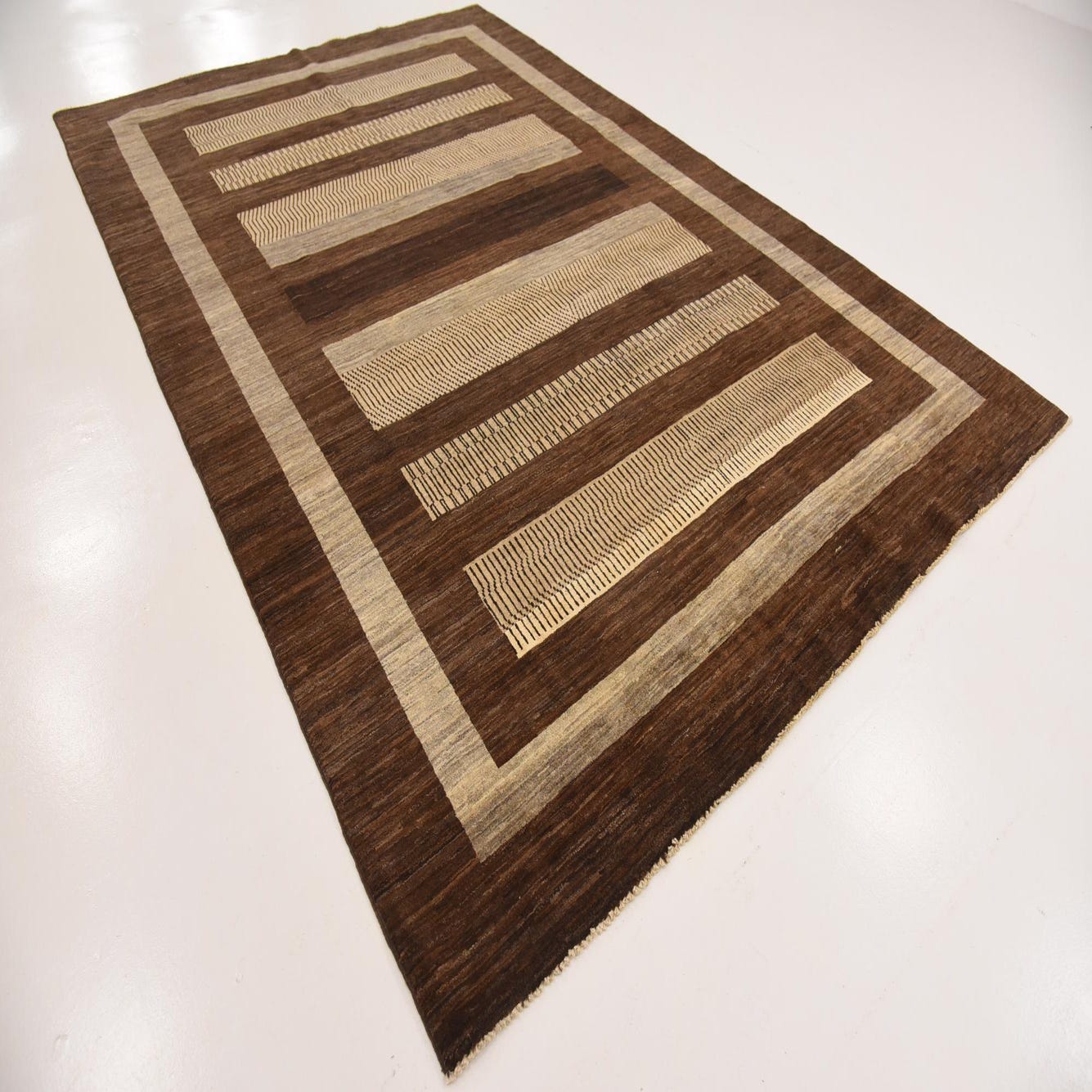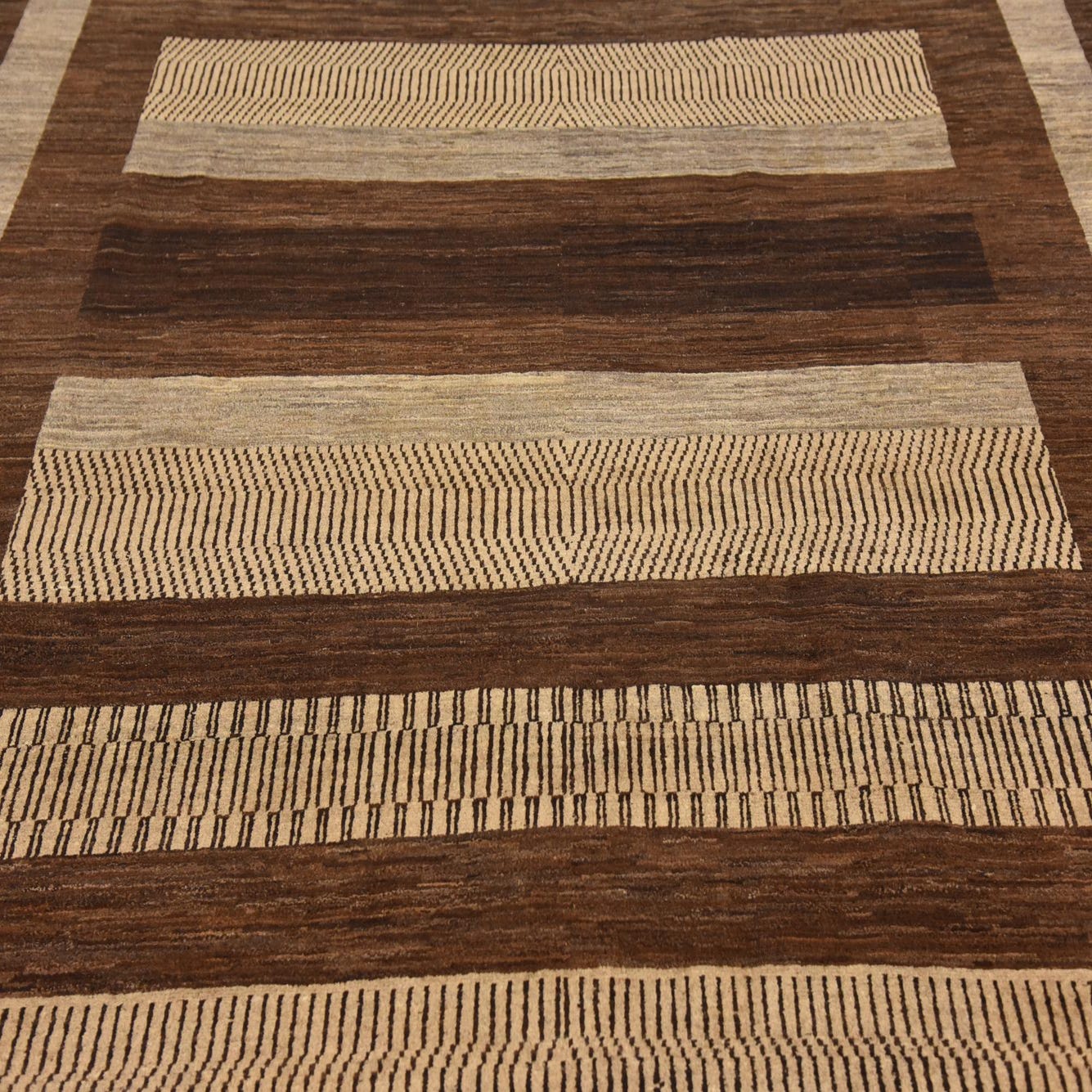Showing a crisp and purposeful pattern, the rug features horizontal bands that combine light brown and cream hues set against a rich brown background. The play of color and pattern creates a visually engaging landscape while the bordered edge adds a structured elegance to the overall design.