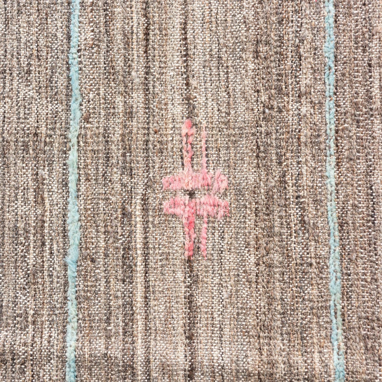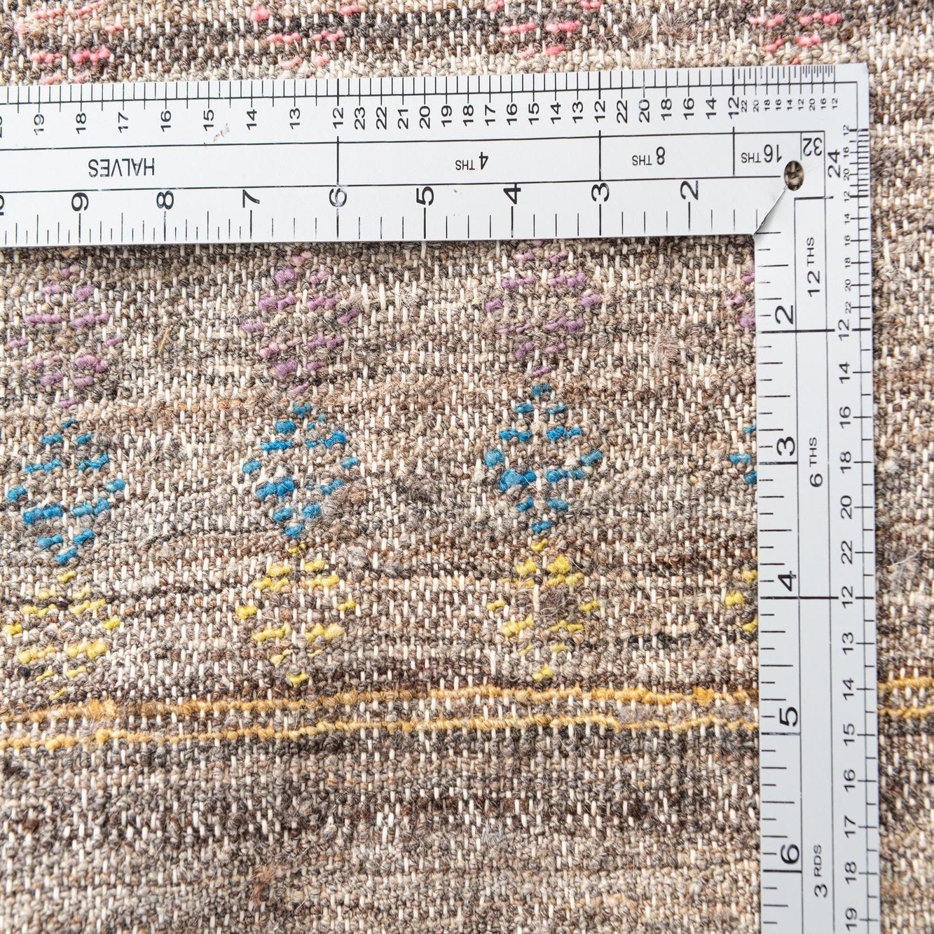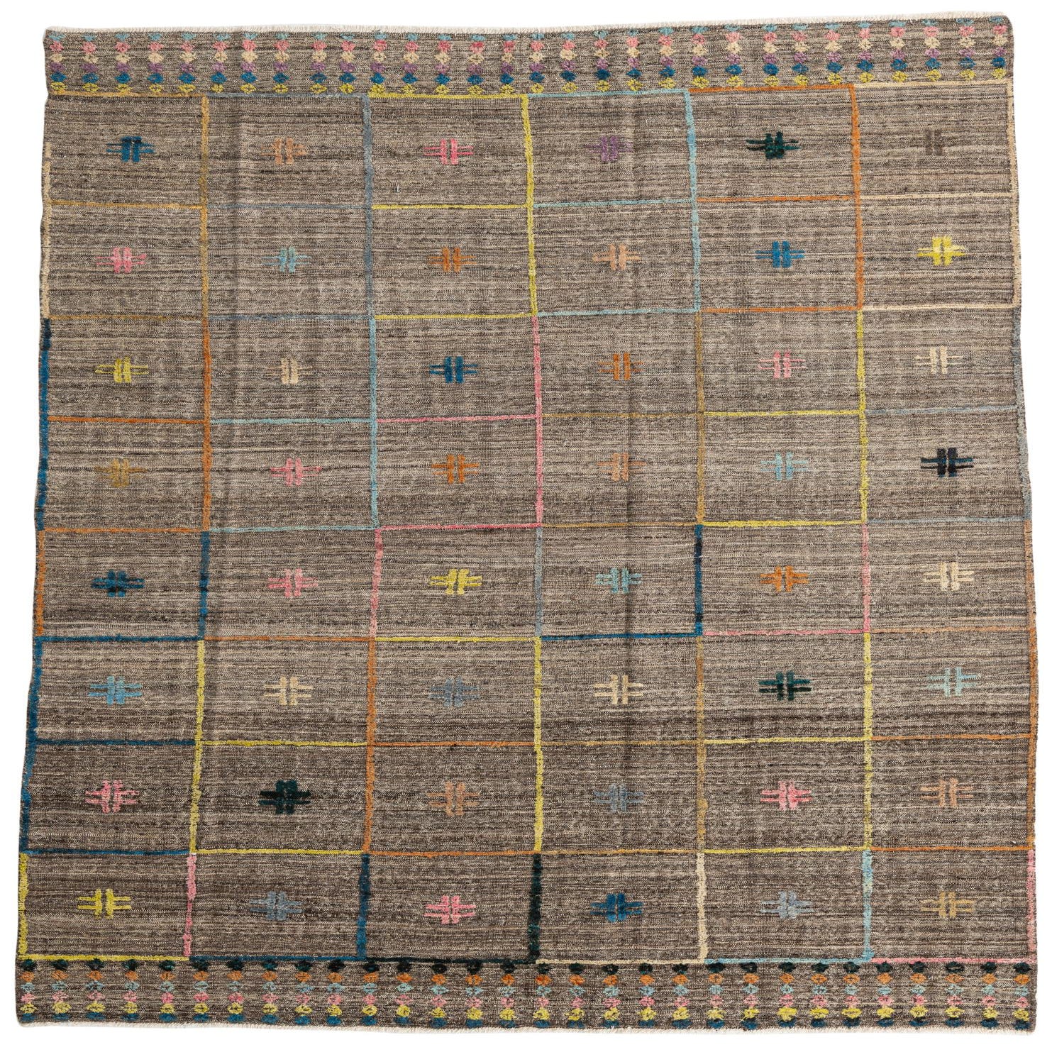 Primary color is Brown. Colors in this rug include: Brown, Blue, Gray, Yellow, Pink, Navy Blue, Beige, Black.