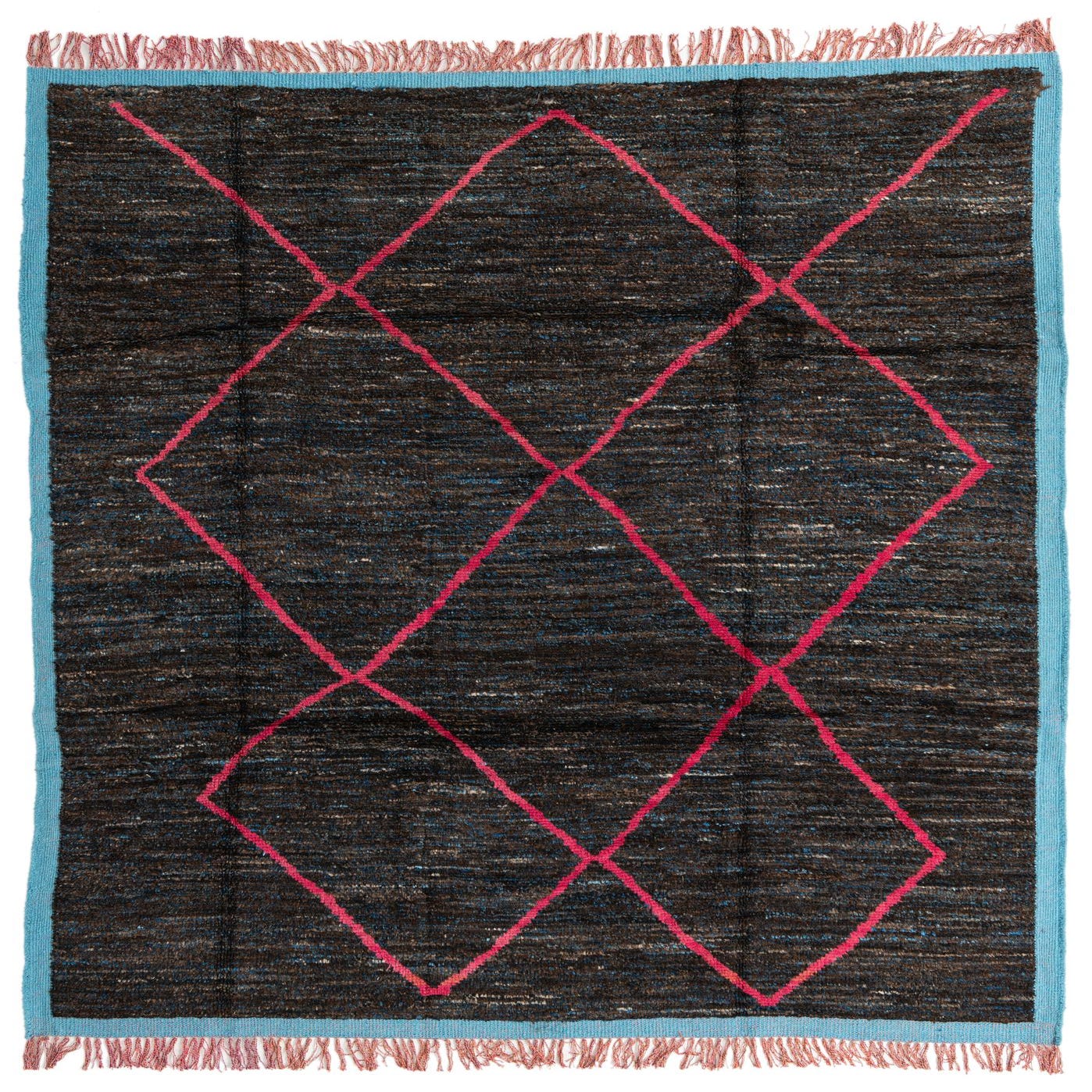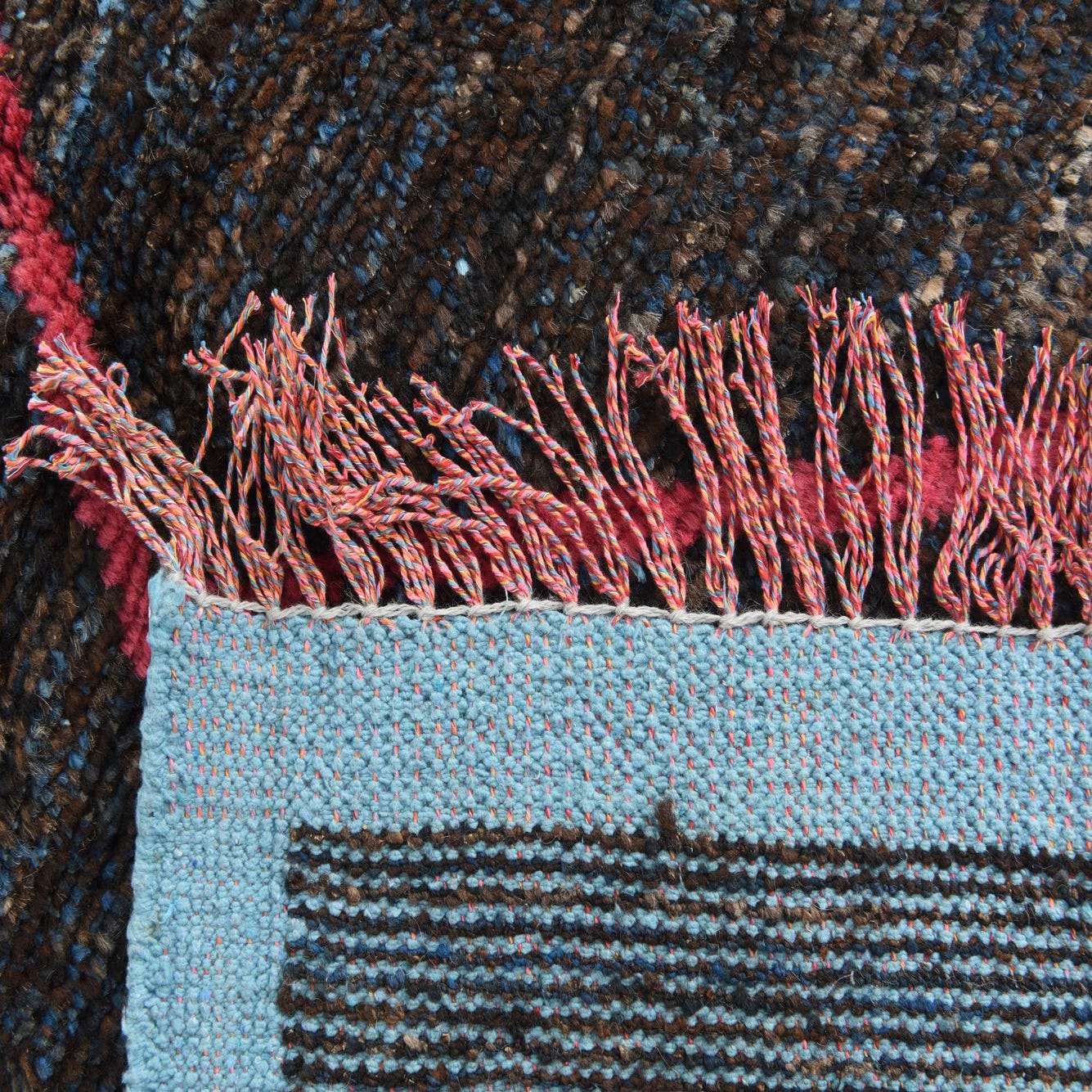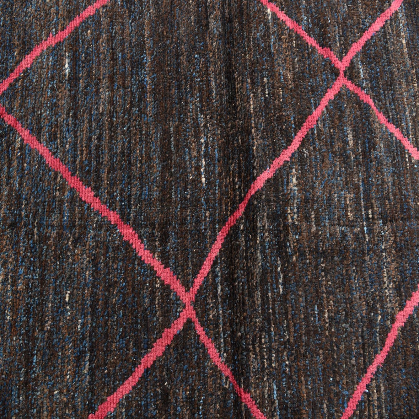 This Moroccan collection rug, measuring 7x10 feet, is hand-knotted from 100% wool, which ensures durability and a plush feel underfoot. The design exhibits a robust brown background that provides a warm, grounding effect to any space. It features a minimalistic geometric pattern with bold, red linear accents that create a sequence of diamond shapes, offering visual interest without overwhelming the senses. Pops of light blue define the rug's borders, adding a serene contrast to the design.