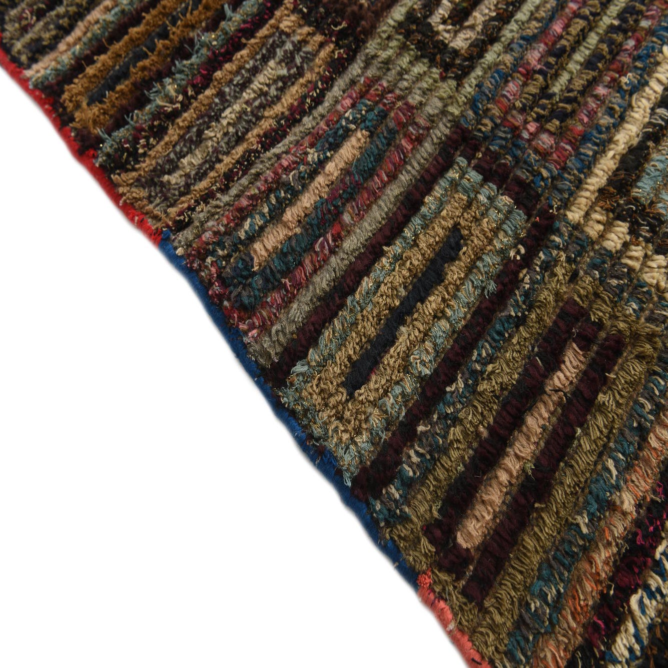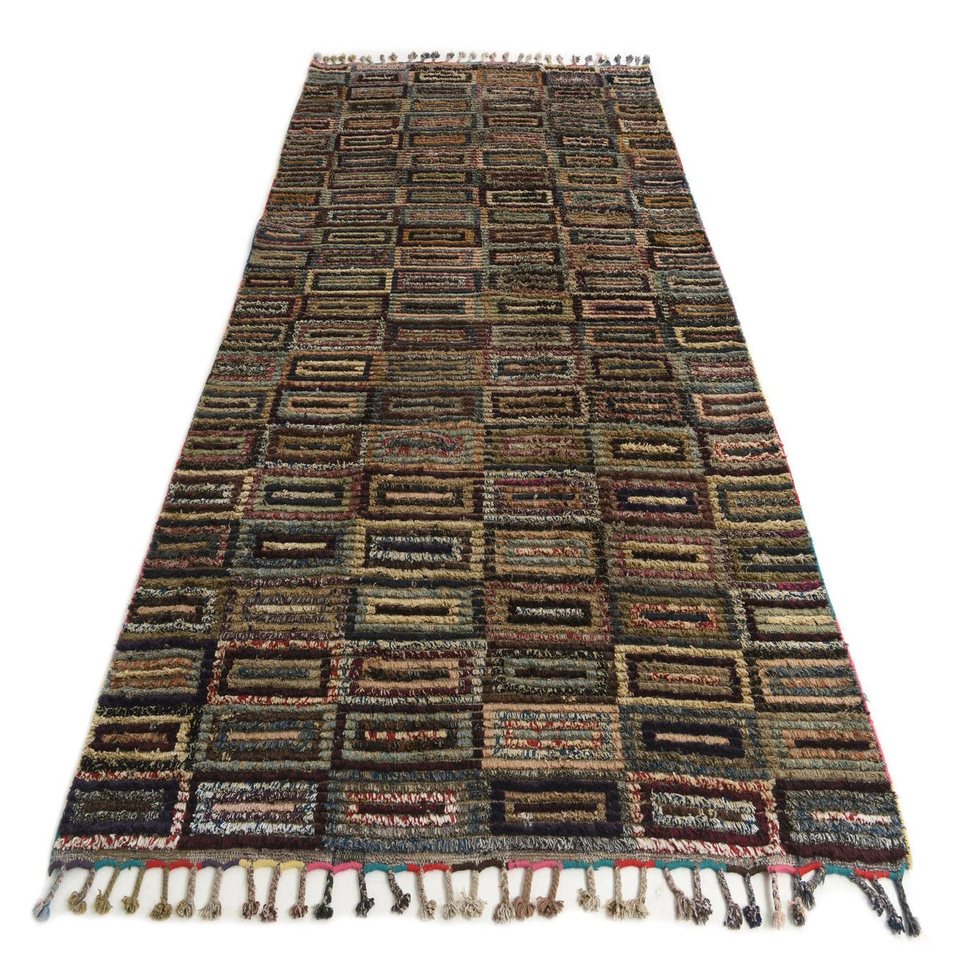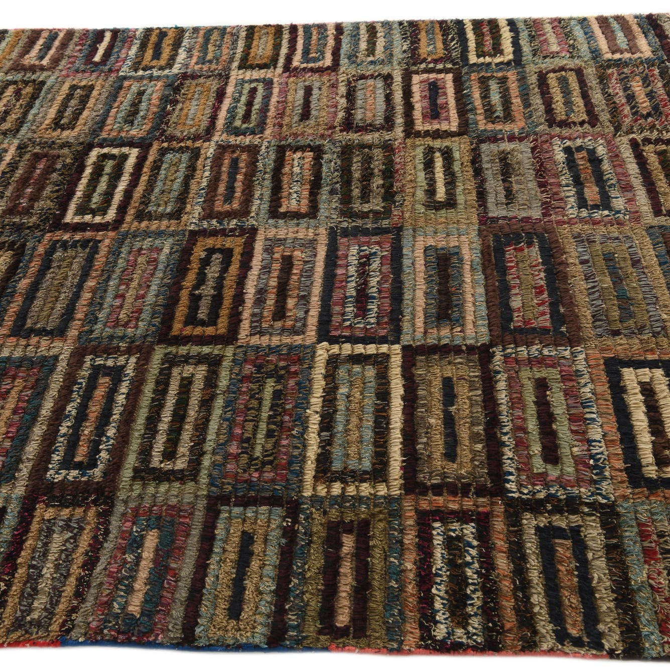 A 7x10 rectangular shag rug with a modern tribal pattern of brown, tan, and multi-colored rectangles, suitable for a living room.