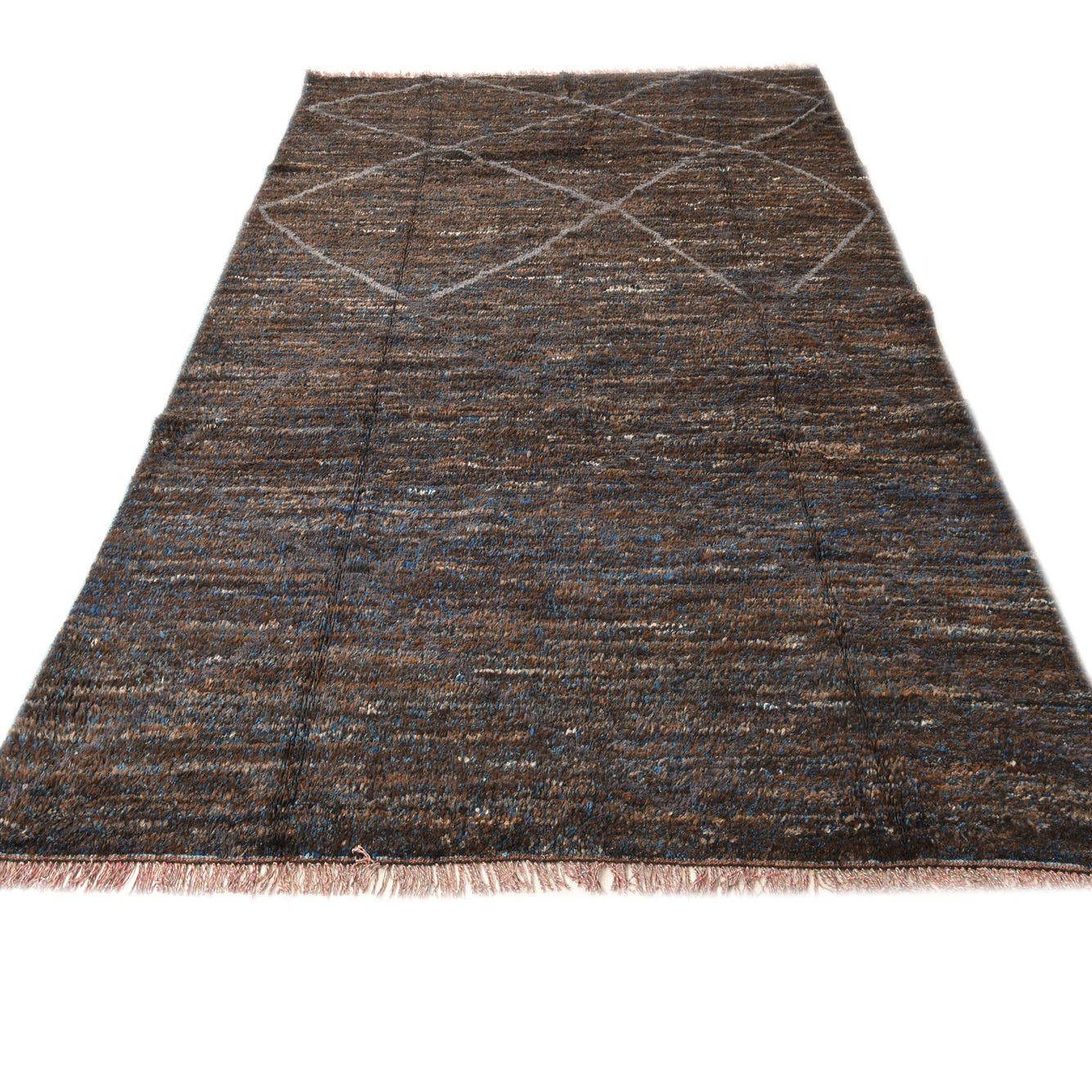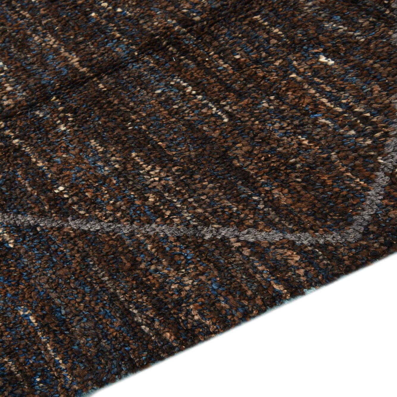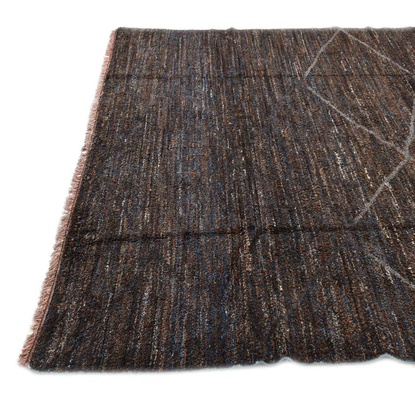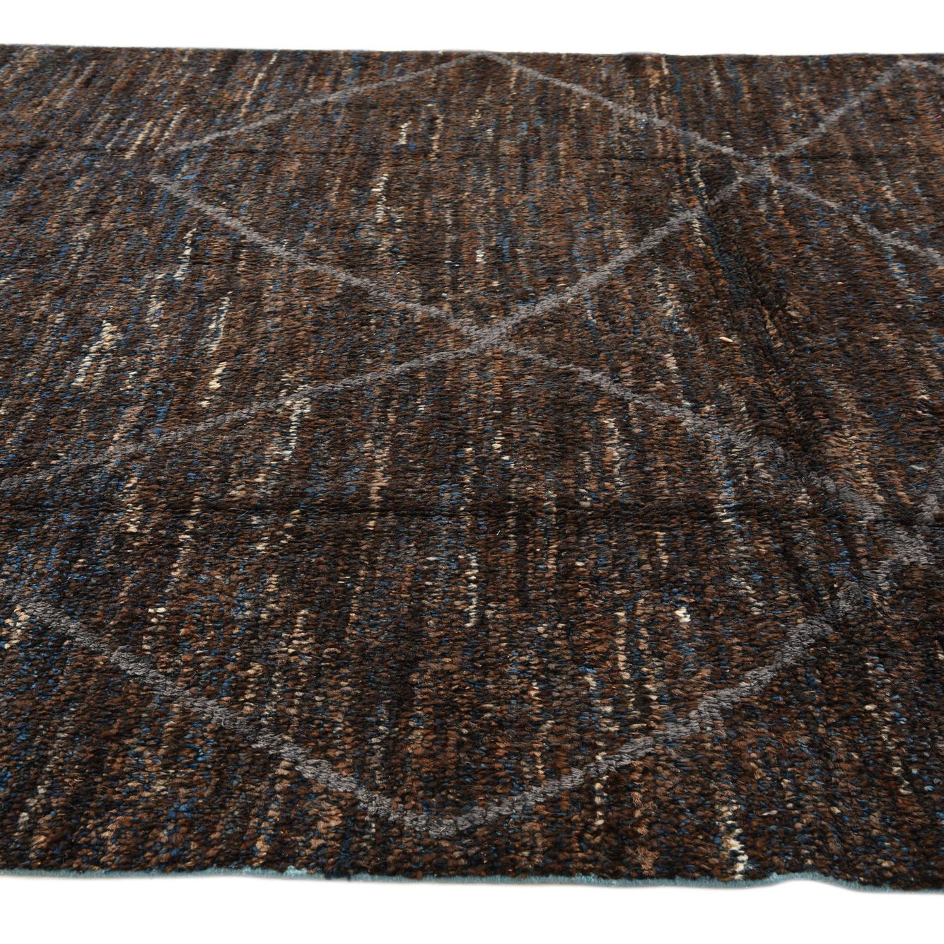 This Moroccan collection rug, size 7x10, is a superb choice for a variety of interior spaces. It is hand-knotted from 100% wool, offering both durability and a soft texture underfoot. The rug features a rich brown background with an overlay of geometric patterns in complementary shades of gray and blue, providing a sense of depth and complexity to its design.