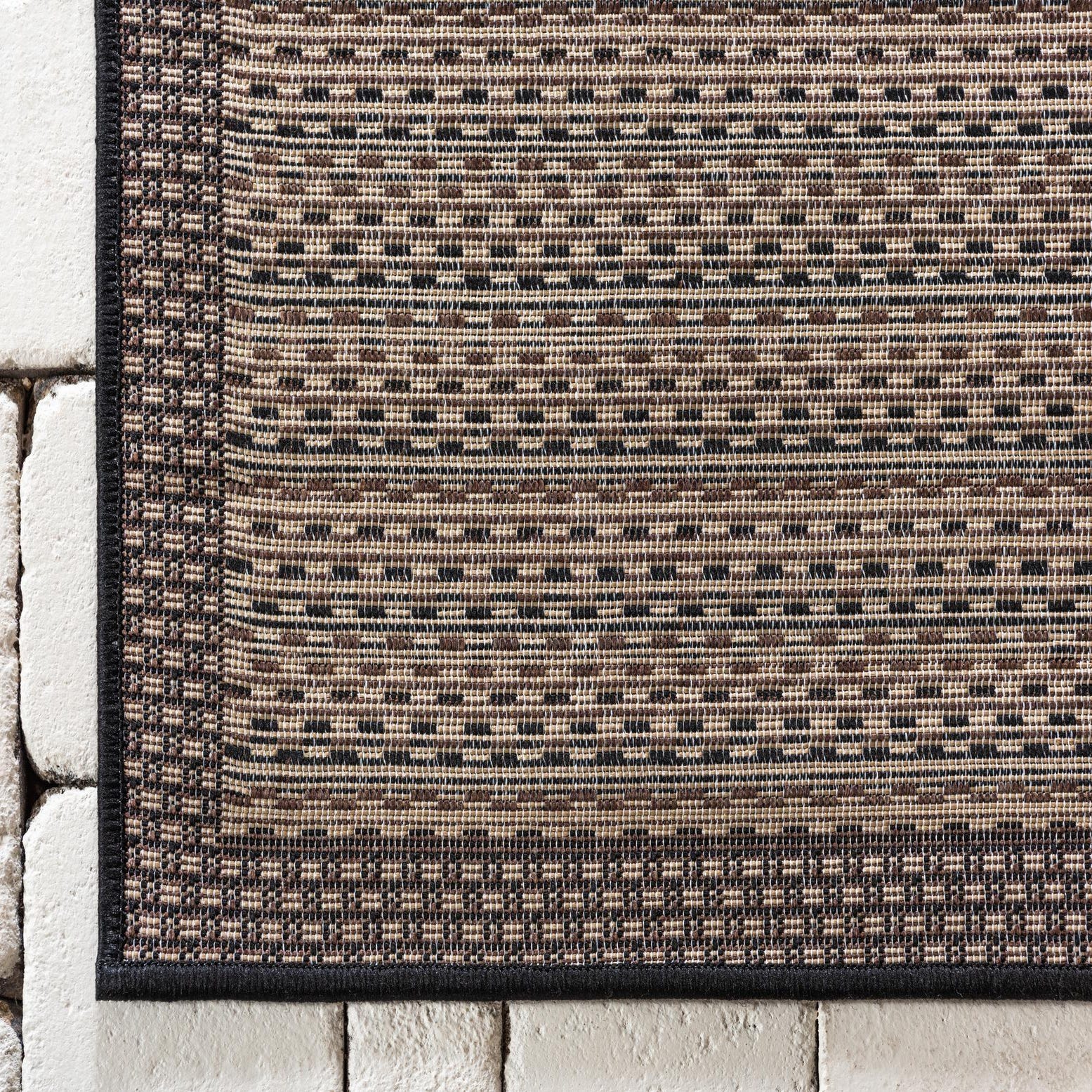 Well-suited to high-traffic spots, this rug anchors covered patios, sunrooms, or entryways and works nicely under an outdoor dining set or a pair of lounge chairs. It pairs easily with natural materials like teak and wicker, matte black metal frames, or a neutral, modern interior palette where the brown background and black detailing can ground layered textiles and accessories.