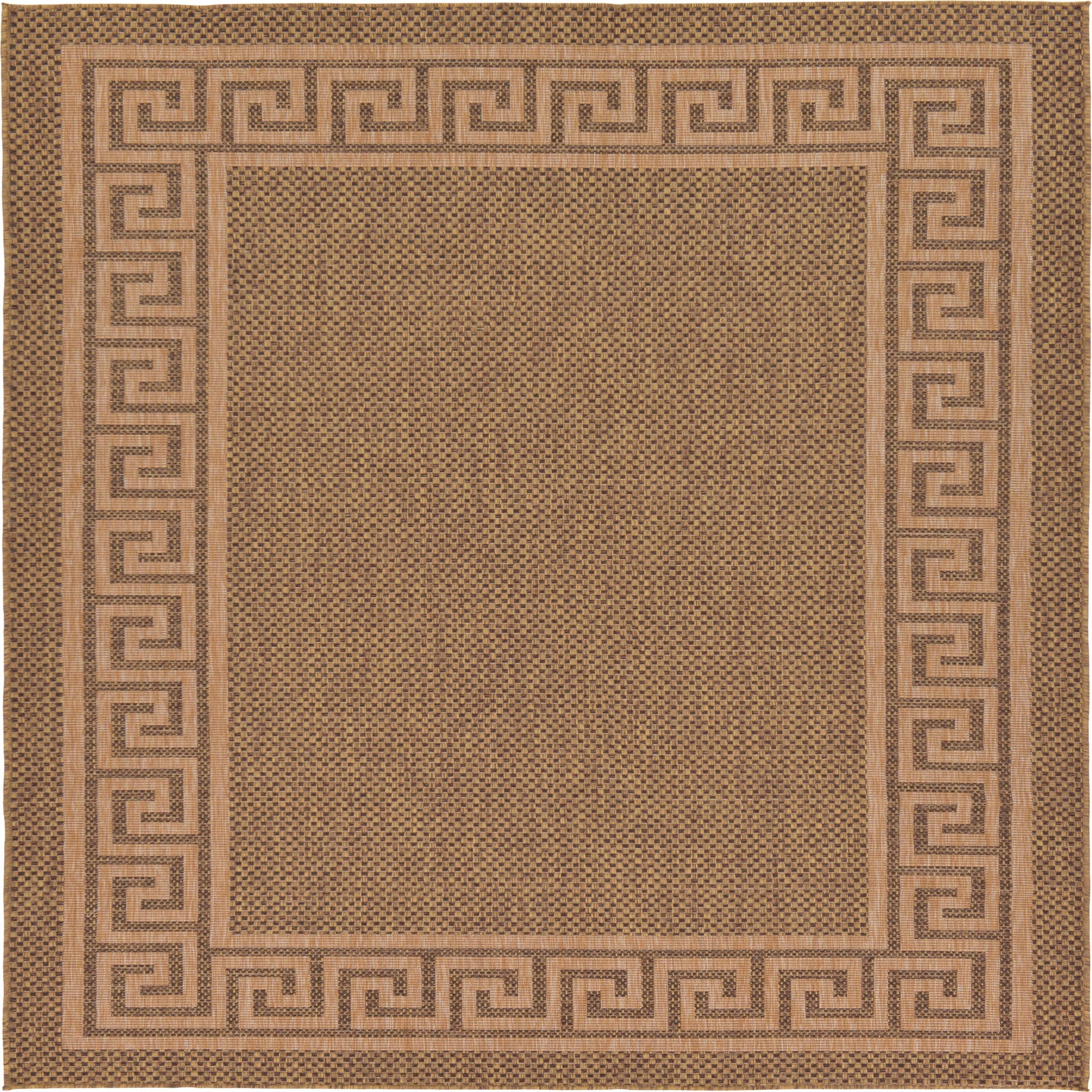 A 7x10 rectangular brown and tan indoor/outdoor rug with a modern Greek key border pattern.