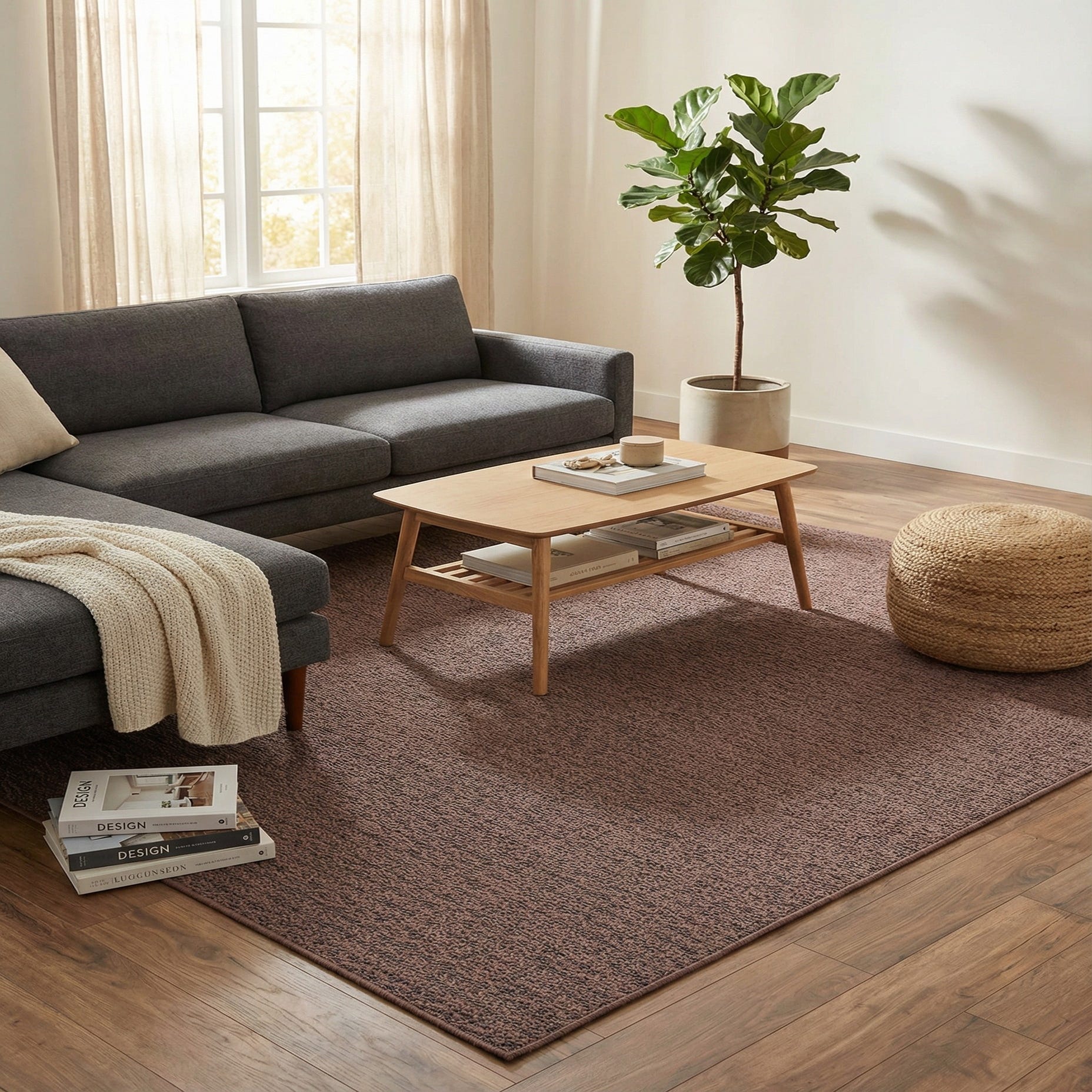 This machine-made rug is crafted from 100% polypropylene in a warm brown ground, woven into a low-profile, tightly constructed surface that feels smooth and slightly textured underfoot. The pattern is a subtle, linear wave motif—tiny, repeating loops and stitches form horizontal bands that add quiet movement without overwhelming the space. The matte finish and close weave give it a refined, uncomplicated look that layers easily with other textiles.