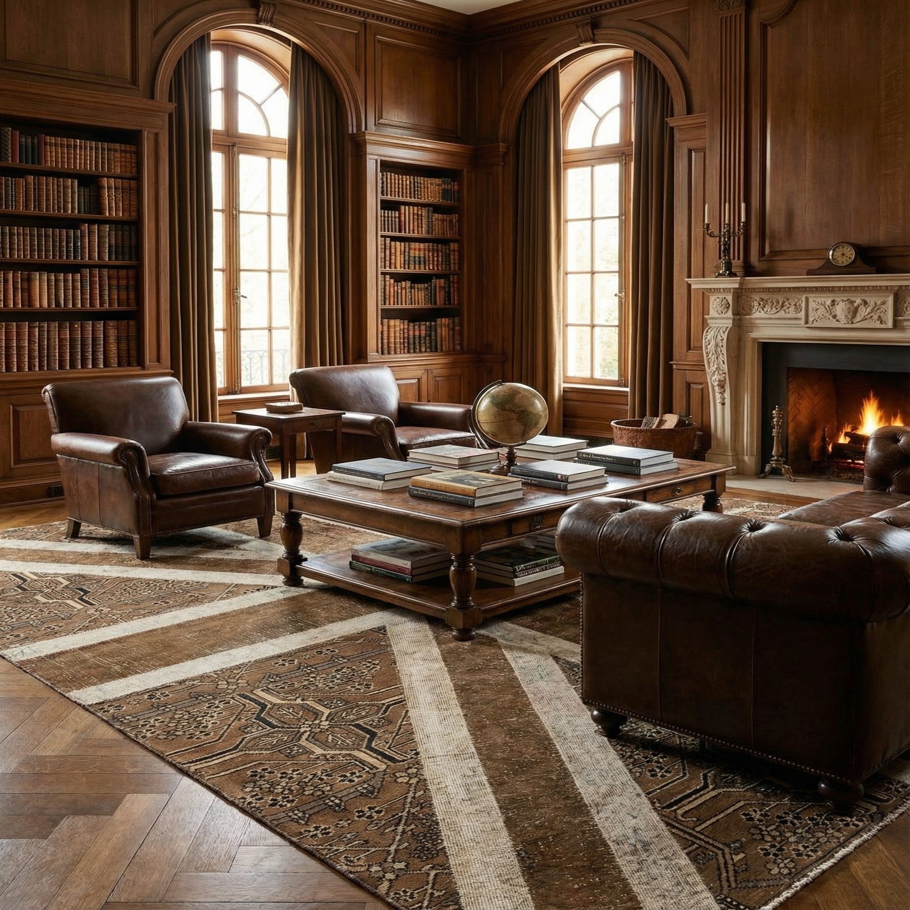 This versatile rug would seamlessly integrate into a variety of design scenarios, from traditional spaces where its classic motifs will resonate with other period elements, to modern and contemporary environments where the bold geometry can serve as a focal point. The neutral yet diverse color palette ensures compatibility with a wide array of furniture and décor, making it suitable for use in living rooms, dining areas, or spacious bedrooms where its substantial size and artistic presence can be fully appreciated.