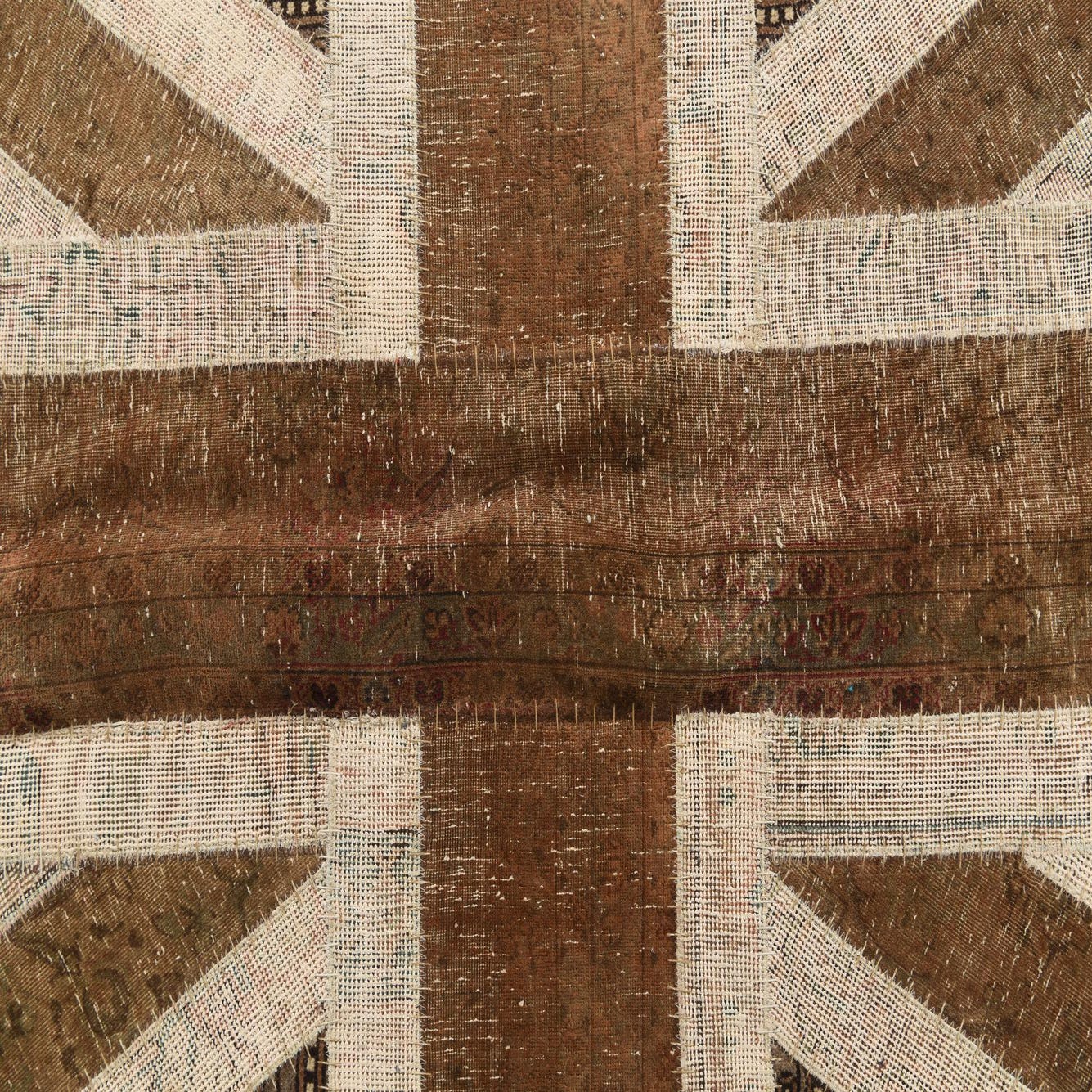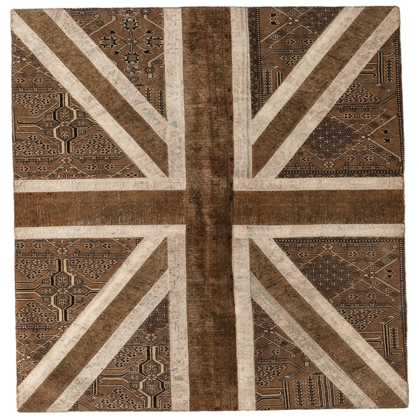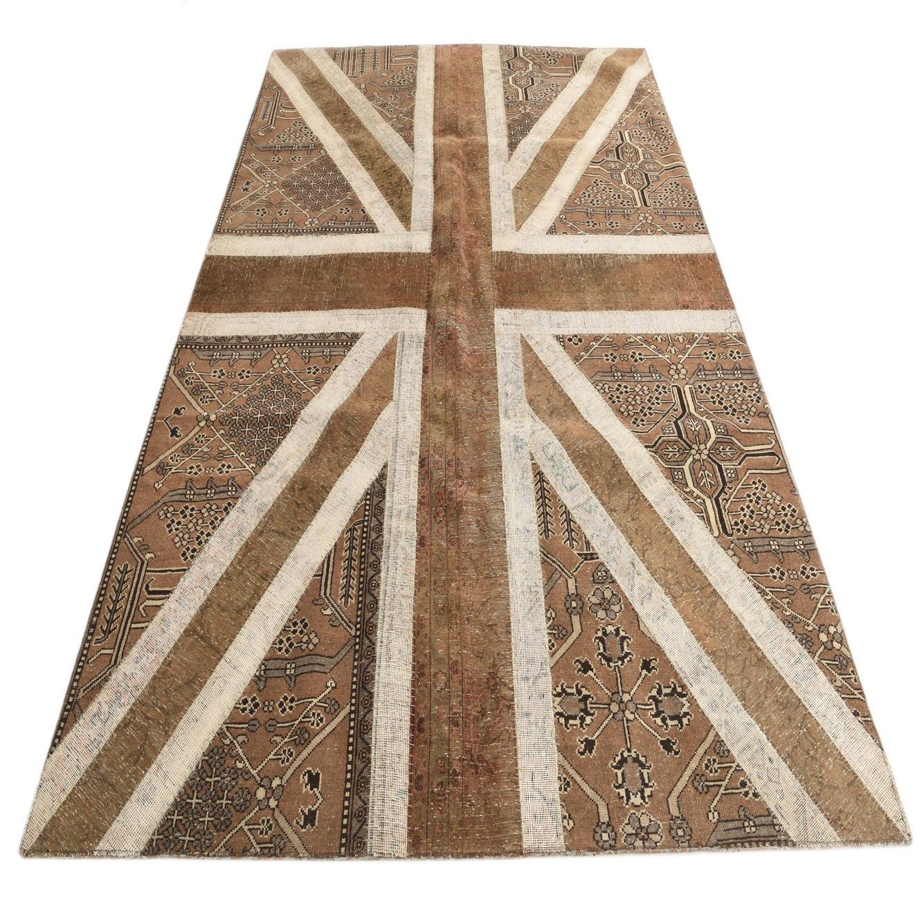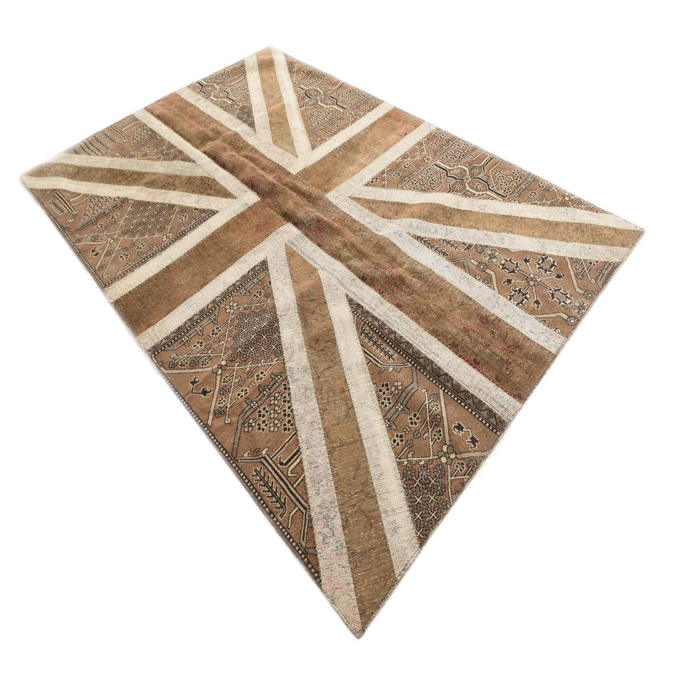 A 7x10 rectangular Ultra Vintage wool rug featuring a distressed Union Jack flag pattern in browns and tans with traditional Persian motifs.