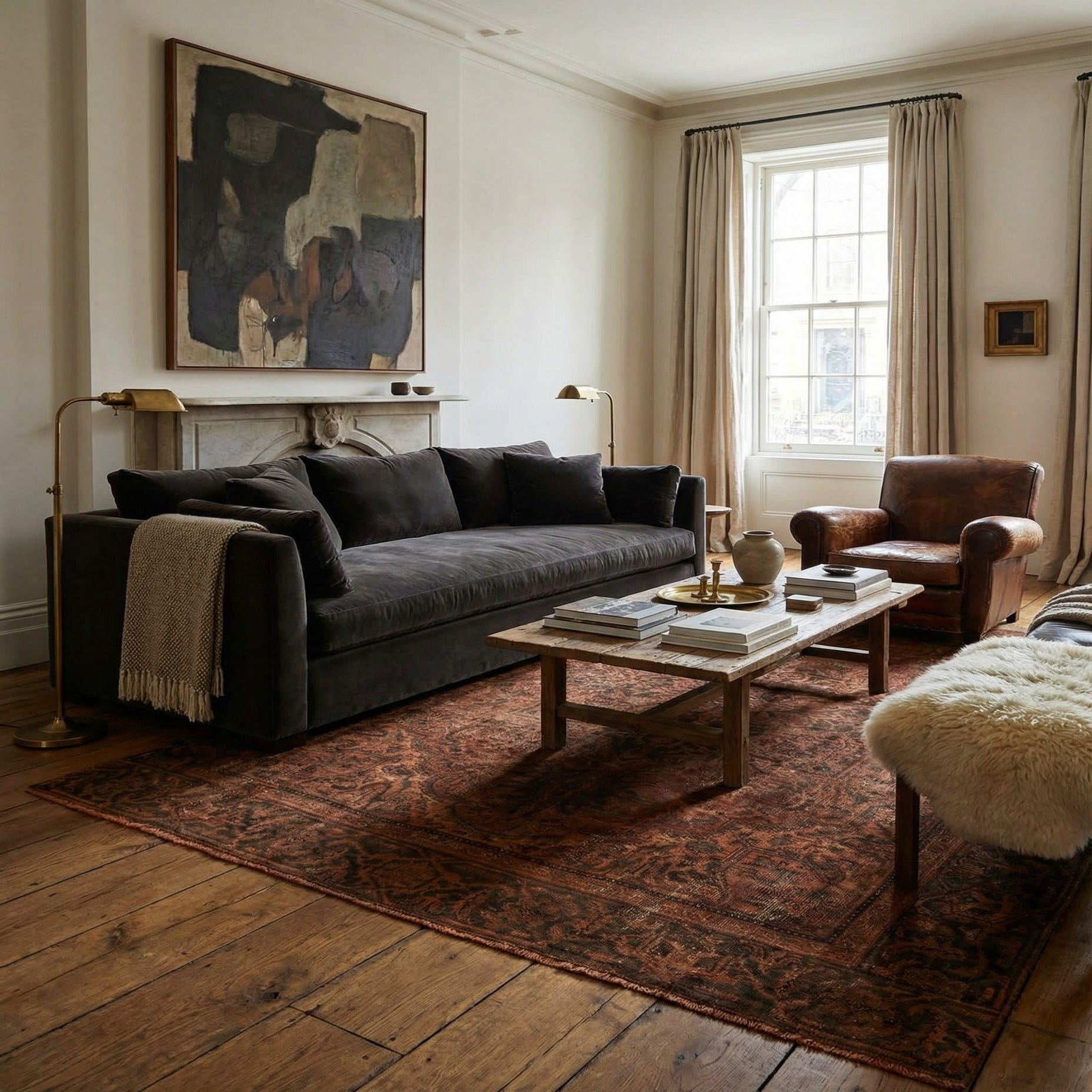 This rug's timeless design and color palette would be a perfect complement to a variety of decor styles, including traditional, rustic, and eclectic interiors. It could serve as a statement piece in a living room, grounding the furniture with its classic elegance, or add warmth and history to a dining room, pairing beautifully with wooden furnishings and natural textures. Its versatile aesthetic allows it to seamlessly integrate with both understated and bold design choices, making it a valuable addition to a curated home.