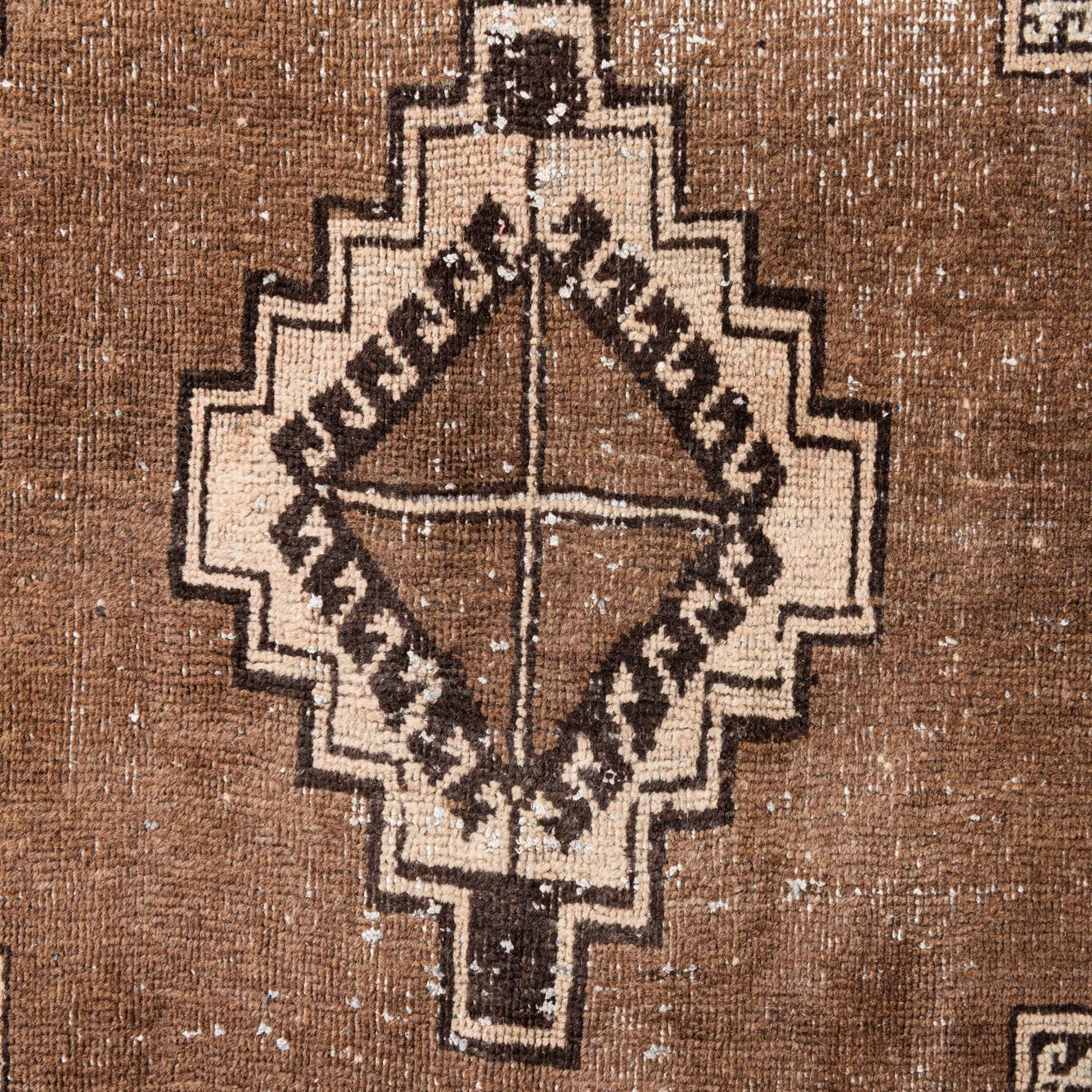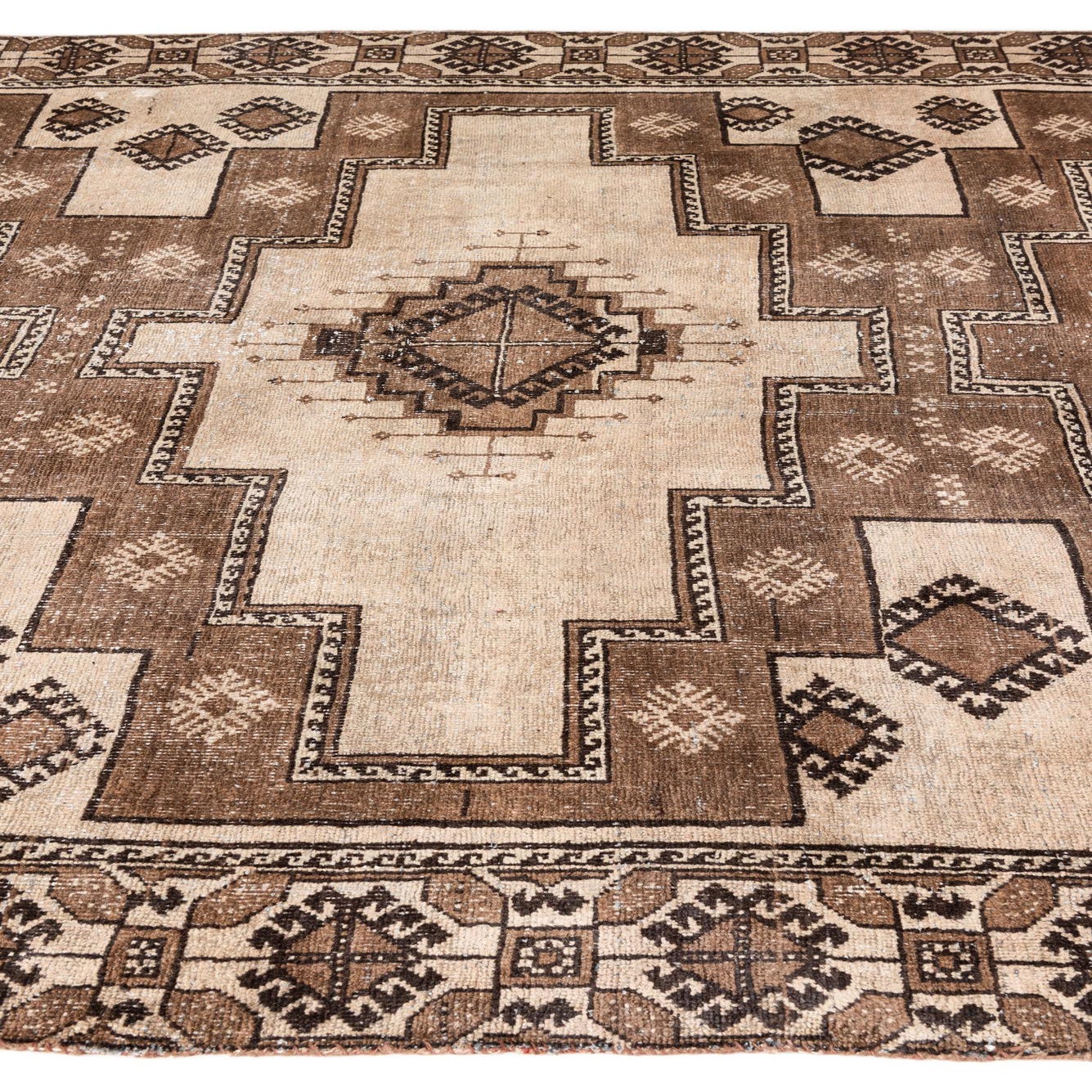 This Ultra Vintage collection rug is a hand-knotted piece crafted from 100% wool, measuring 7x10 feet. The rug presents a dynamic geometric pattern with a well-defined central medallion, border details, and angular motifs, creating a sense of structure and harmony. The color palette is grounded in brown, with ivory contrasts that add a visual lift to the design. The tactile texture of the wool provides a soft underfoot experience while ensuring durability.