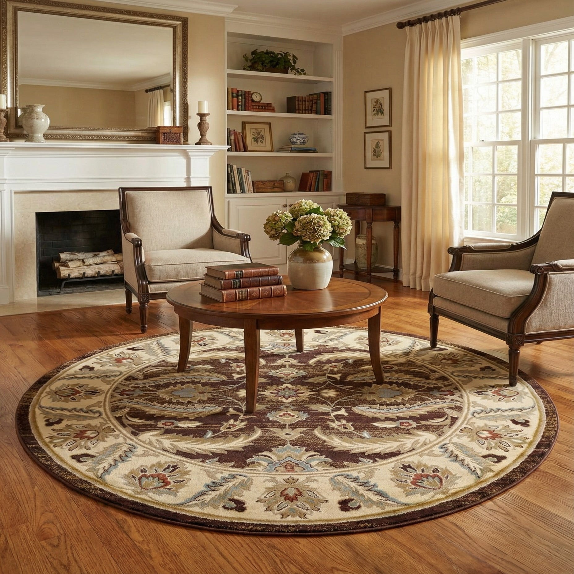 A rich brown field anchors a traditional, Persian-inspired round rug patterned with a central medallion and sweeping foliate motifs. Cream forms the wide outer border where repeated palmettes and leafy sprays create a framed look, while accents of light blue, green, tan, rust red, red and small candy highlights bring dimension to the design. The motifs are clearly defined against the brown background, and the balanced color palette gives the piece a classic, collected feel.