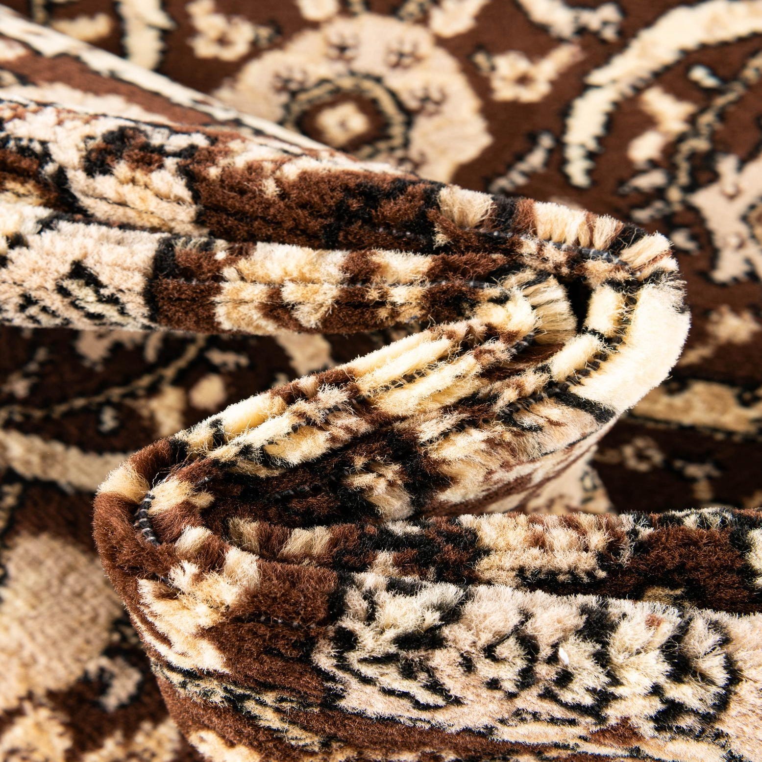 This rug works well beneath a round dining table, centered in a cozy seating group, or layered over hardwood to warm a living room. It pairs naturally with warm wood finishes, leather or upholstered seating in neutral tones, and traditional or transitional decor schemes where classic patterning is desired without heavy visual weight. The brown background and neutral accents also make it a good anchor for spaces that mix antiques with modern pieces.