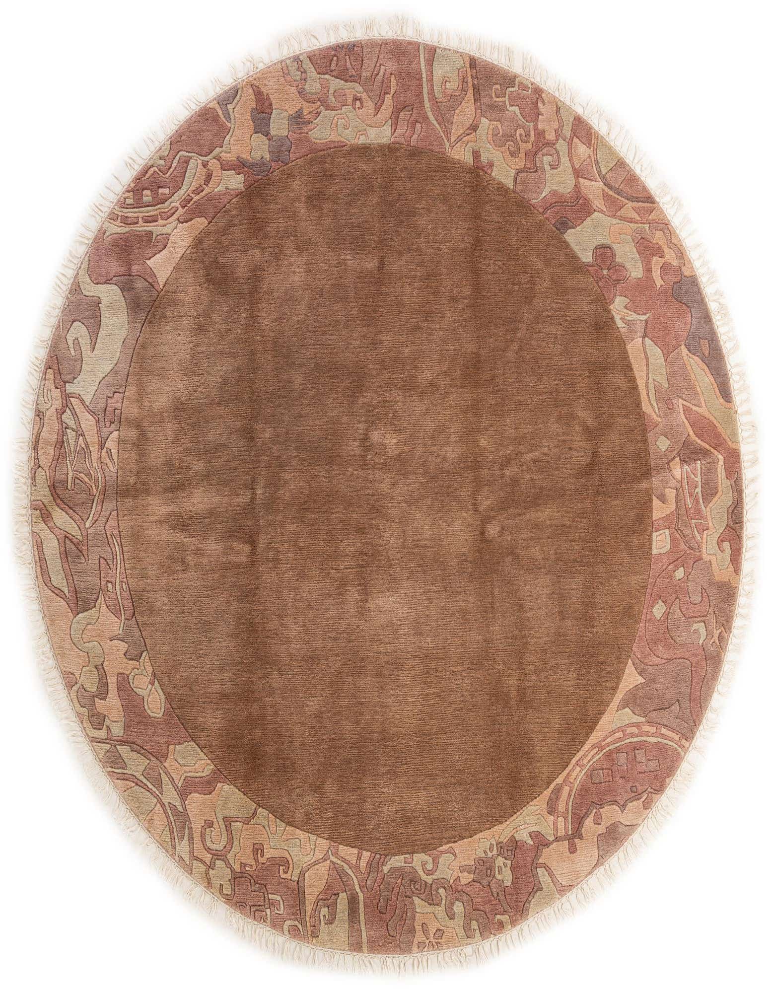A round 8' 0 x 8' 2 brown wool rug with a modern oriental abstract border pattern in tans and browns, featuring a medium pile and fringe.
