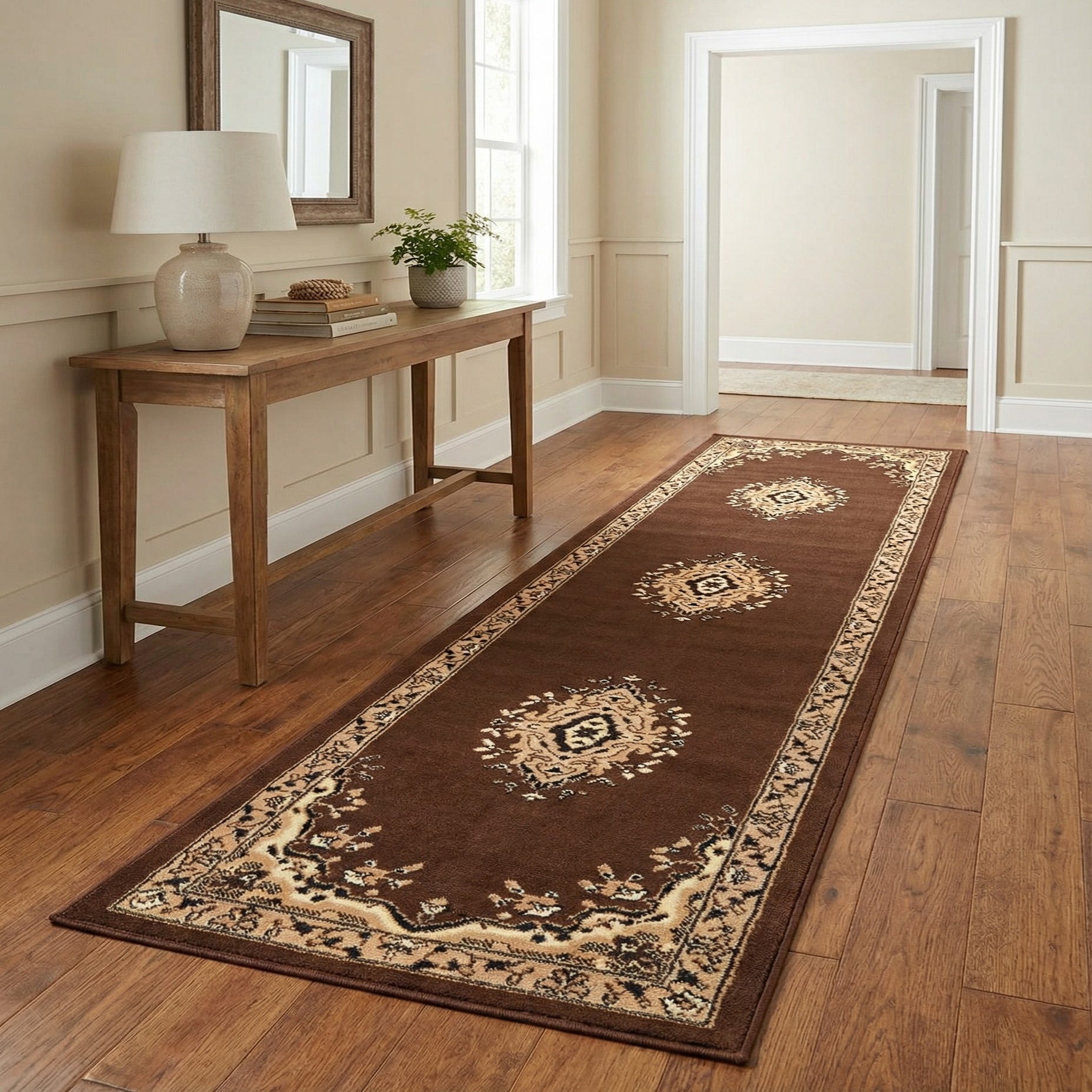 Ideal for long hallways or transitional spaces, this piece's stain-resistant and shed-free properties ensure it remains a lasting addition to any home. The color palette and timeless pattern make it versatile for coordinating with a range of decor styles, from traditional to more contemporary spaces, adding warmth and definition to any interior design. Whether placed in an entryway, alongside a dining area, or as an accent in a living room, this runner enriches the space with its subtle elegance and refined charm.