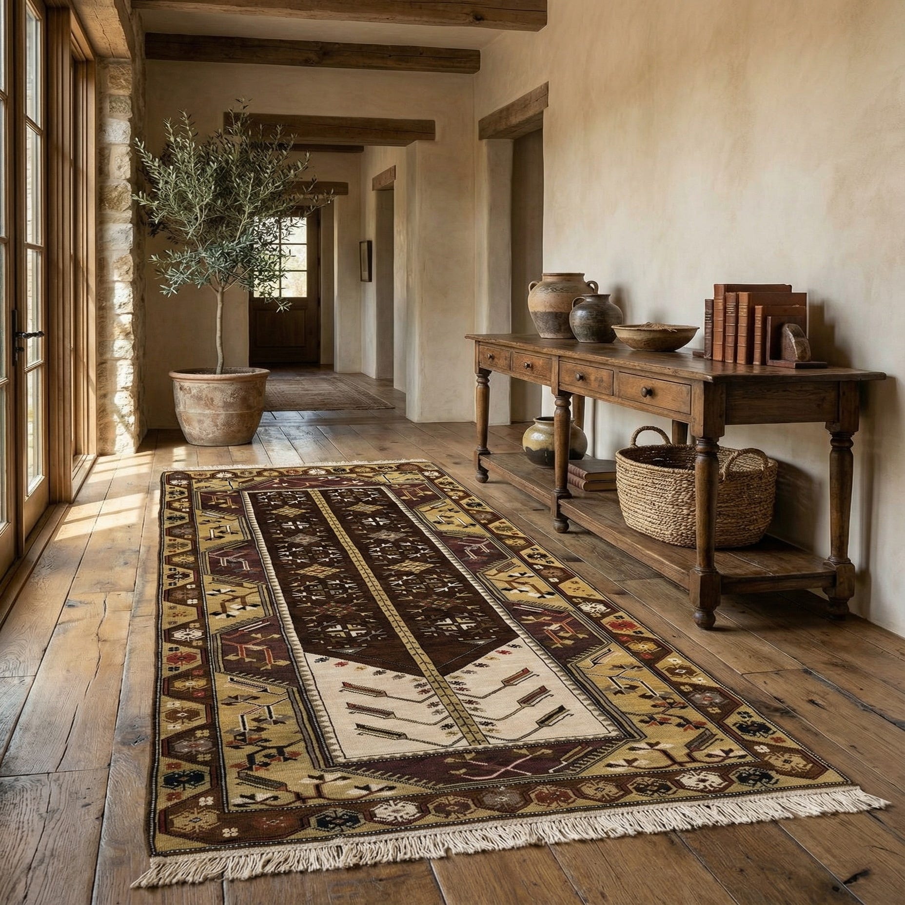 Ideally suited for spaces that embrace a traditional or rustic decor, the color palette and authentic design can also fit well into transitional spaces that blend old with new. This runner can make a statement in hallways, alongside a dining table in narrow kitchens, or in any area that can benefit from a warm, historical touch.