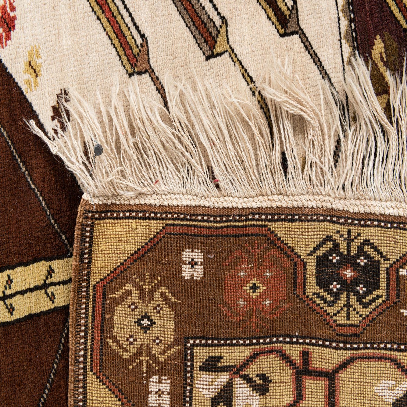 Primary color is Brown. Colors in this rug include: Brown, Ivory, Olive, Terracotta, Gray.