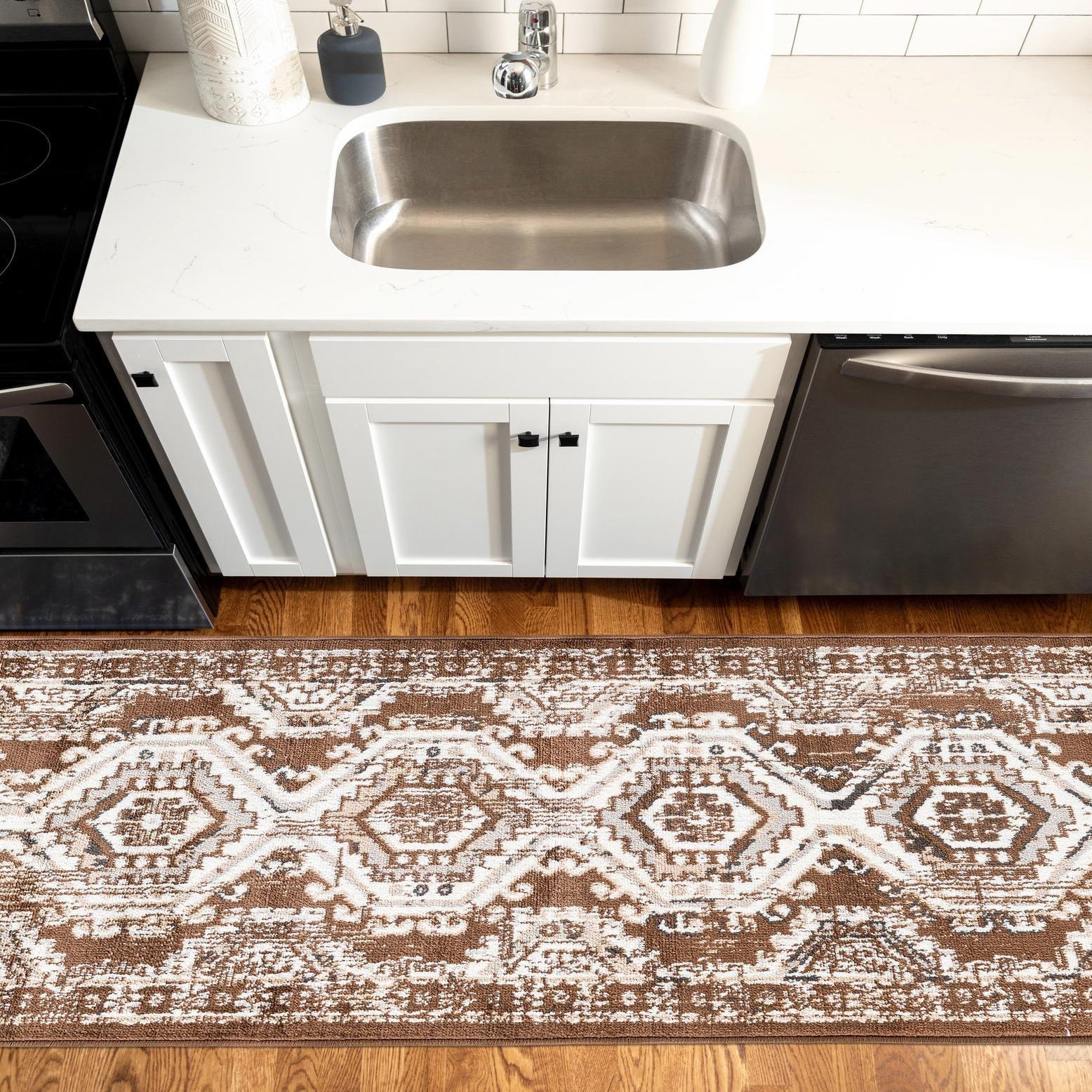 A long 8 ft runner rug in shades of brown and tan with a traditional tribal pattern, ideal for a hallway or kitchen.