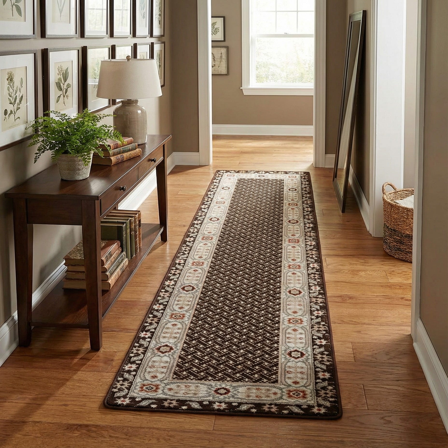Primary color is Brown. Colors in this rug include: Brown, Beige, Gray, Ivory, Rust Red.