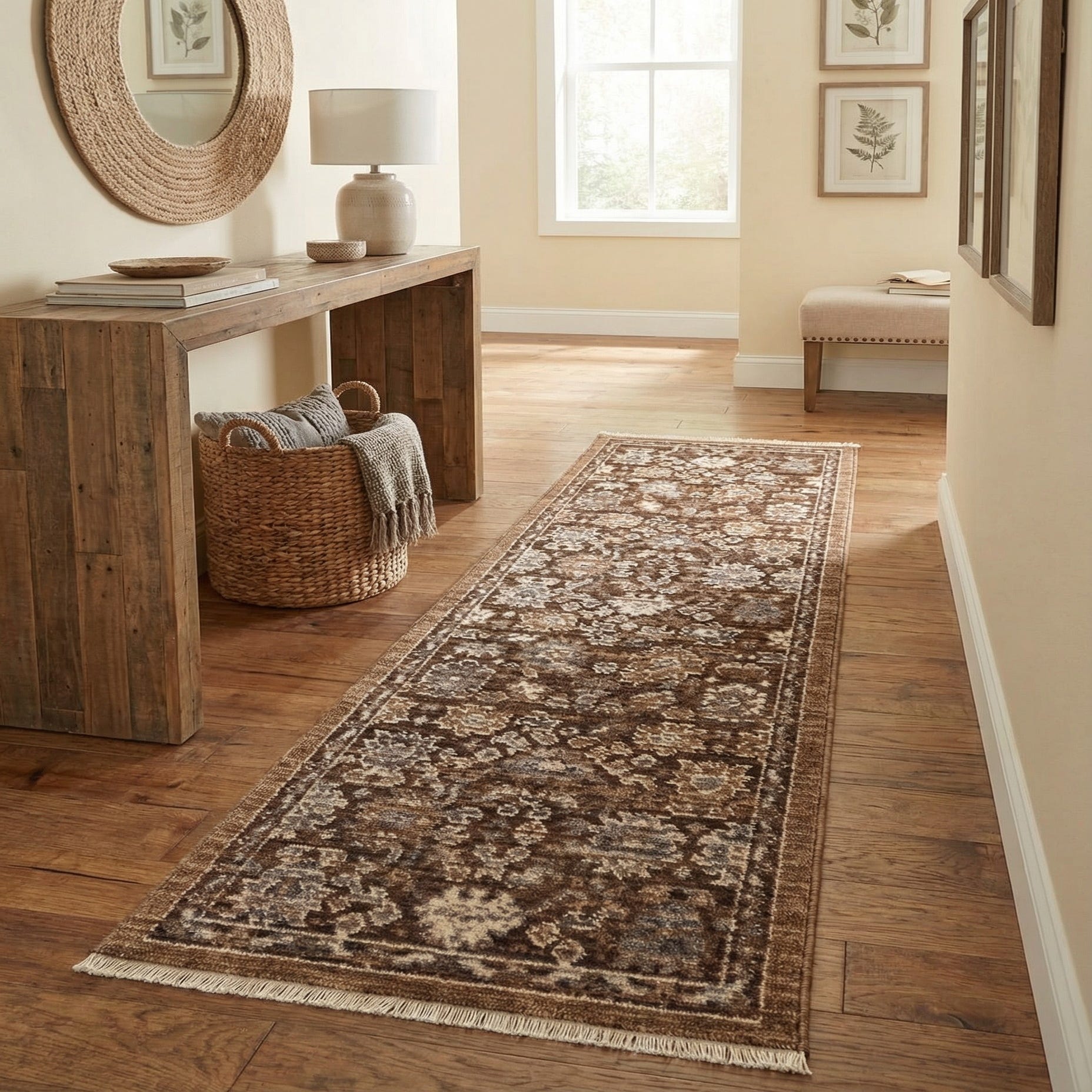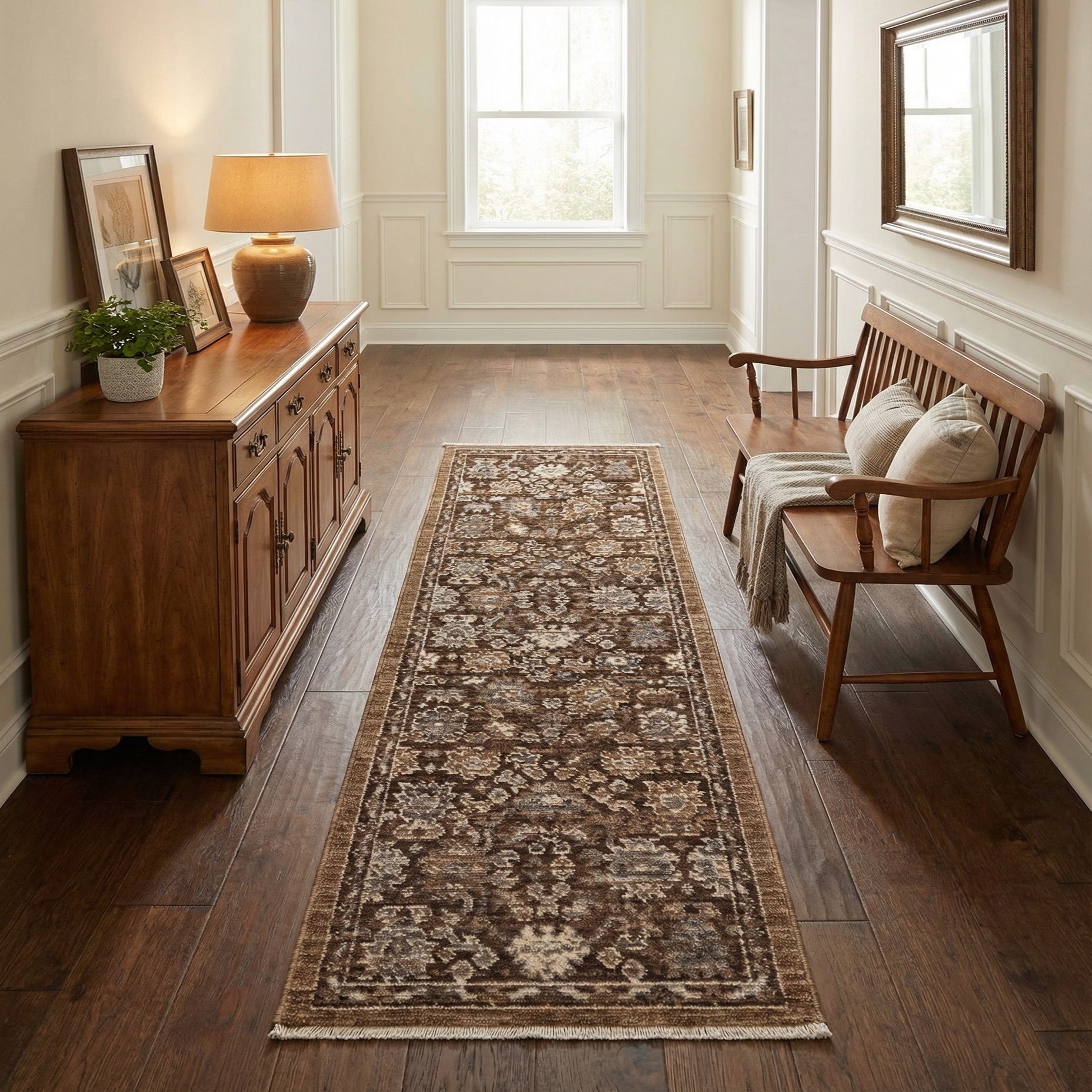 Primary color is Brown. Colors in this rug include: Brown, Gray, Ivory.