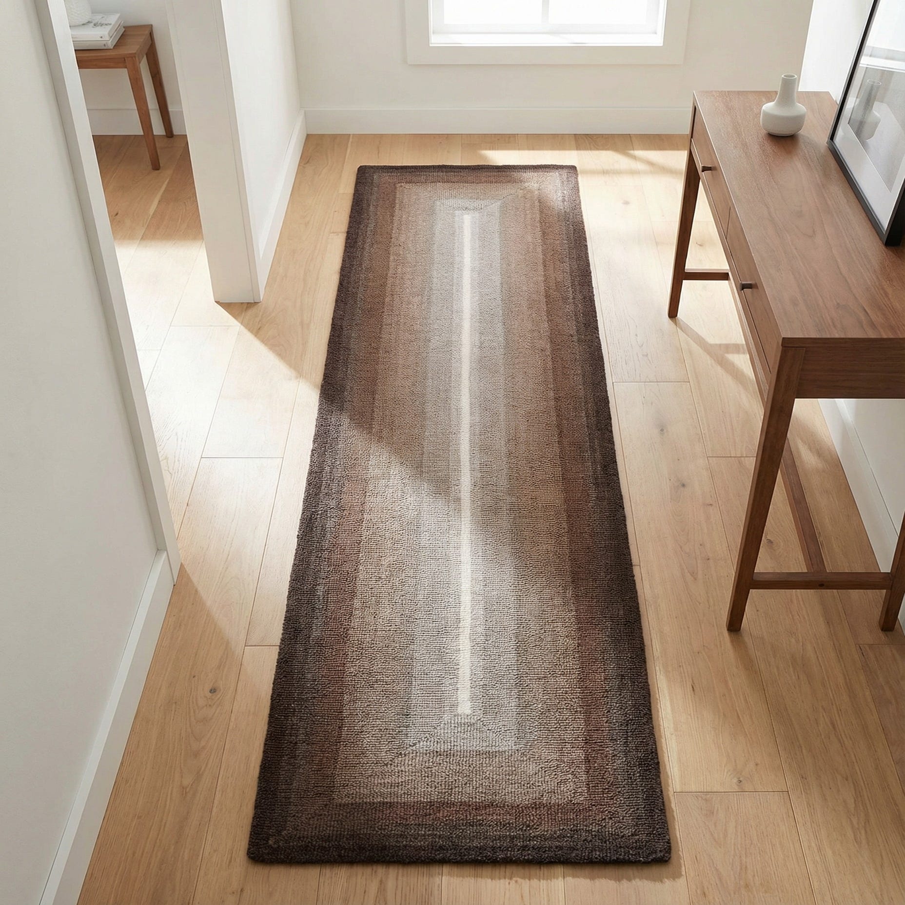 A modern 8 ft runner rug featuring an ombre pattern of browns and tans, with a light vertical stripe down the center, ideal for a hallway.
