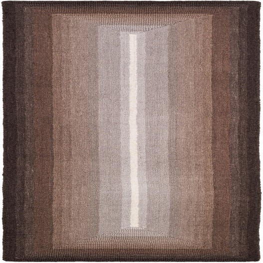 A modern 8 ft runner rug featuring an ombre pattern of browns and tans, with a light vertical stripe down the center, ideal for a hallway.